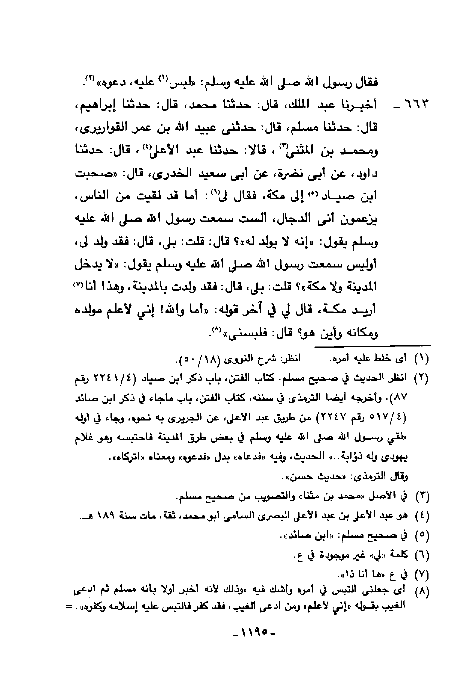 663 - أَخْبَرَنَا عَبْدُ الْمَلِكِ، قَالَ: حَدَّثَنَا مُحَمَّدٌ، قَالَ: حَدَّثَنَا إِبْرَاهِيمُ، قَالَ: حَدَّثَنَا مُسْلِمٌ، قَالَ: حَدَّثَنِي عُبَيْدُ اللَّهِ بْنُ عُمَرَ الْقَوَارِيرِيُّ، وَمُحَمَّدُ بْنُ الْمُثَنَّى، قَالَا: حَدَّثَنَا عَبْدُ الْأَعْلَى، قَالَ: حَدَّثَنَا دَاوُدُ، عَنْ أَبِي نَضْرَةَ، عَنْ أَبِي سَعِيدٍ الْخُدْرِيِّ، قَالَ: صَحِبْتُ ابْنَ صَيَّادٍ إِلَى مَكَّةَ، فَقَالَ لِي: أَمَا قَدْ لَقِيتُ مِنَ النَّاسِ، يَزْعُمُونَ أَنِّي الدَّجَّالُ، أَلَسْتَ سَمِعْتَ رَسُولَ اللَّهِ صَلَّى اللهُ عَلَيْهِ وَسَلَّمَ، يَقُولُ: «إِنَّهُ لَا يُولَدُ لَهُ» ؟ قَالَ: قُلْتُ: بَلَى، قَالَ: فَقَدْ وَلَدَ لِي، أَوَلَيْسَ سَمِعْتَ رَسُولَ اللَّهِ صَلَّى اللهُ عَلَيْهِ وَسَلَّمَ، يَقُولُ: «§لَا يَدْخُلُ الْمَدِينَةَ وَلَا مَكَّةَ» ؟ قُلْتُ: بَلَى، قَالَ: فَقَدْ وُلِدْتُ بِالْمَدِينَةِ وَهَذَا أَنَا أُرِيدُ مَكَّةَ، قَالَ لِي فِي آخِرِ قَوْلِهِ: أَمَا وَاللَّهِ إِنِّي لَأَعْلَمُ مَوْلِدَهُ وَمَكَانَهُ وَأَيْنَ هُوَ قَالَ: فَلَبَسَنِي