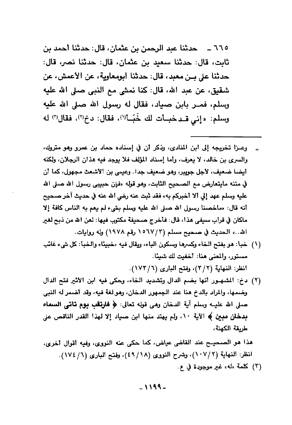 665 - حَدَّثَنَا عَبْدُ الرَّحْمَنِ بْنُ عُثْمَانَ، قَالَ: حَدَّثَنَا أَحْمَدُ بْنُ ثَابِتٍ، قَالَ: حَدَّثَنَا سَعِيدُ بْنُ عُثْمَانَ، قَالَ: حَدَّثَنَا نَصْرٌ، قَالَ: حَدَّثَنَا عَلِيُّ بْنُ مَعَبْدٍ، قَالَ: حَدَّثَنَا أَبُومُعَاوِيَةَ، عَنِ الْأَعْمَشِ، عَنْ شَقِيقٍ، عَنْ عَبْدِ اللَّهِ، قَالَ: كُنَّا نَمْشِي مَعَ النَّبِيِّ صَلَّى اللهُ عَلَيْهِ وَسَلَّمَ فَمَرَّ بِابْنِ صَيَّادٍ، فَقَالَ لَهُ رَسُولُ اللَّهِ صَلَّى اللهُ عَلَيْهِ وَسَلَّمَ: «إِنِّي قَدْ خَبَأْتُ لَكَ خَبَأً» فَقَالَ: دُخٌّ فَقَالَ لَهُ -[1200]- رَسُولُ اللَّهِ صَلَّى اللهُ عَلَيْهِ وَسَلَّمَ: «اخْسَأْ فَلَنْ تَعْدُوَ قَدْرَكَ» فَقَالَ لَهُ عُمَرُ: ذَرْنِي يَا رَسُولَ اللَّهِ فَأَضْرِبُ عُنُقَهُ، فَقَالَ: «دَعْهُ §إِنْ يَكُنِ الَّذِي تَخَافُ فَلَنْ تَسْتَطِيعَ قَتْلَهُ»