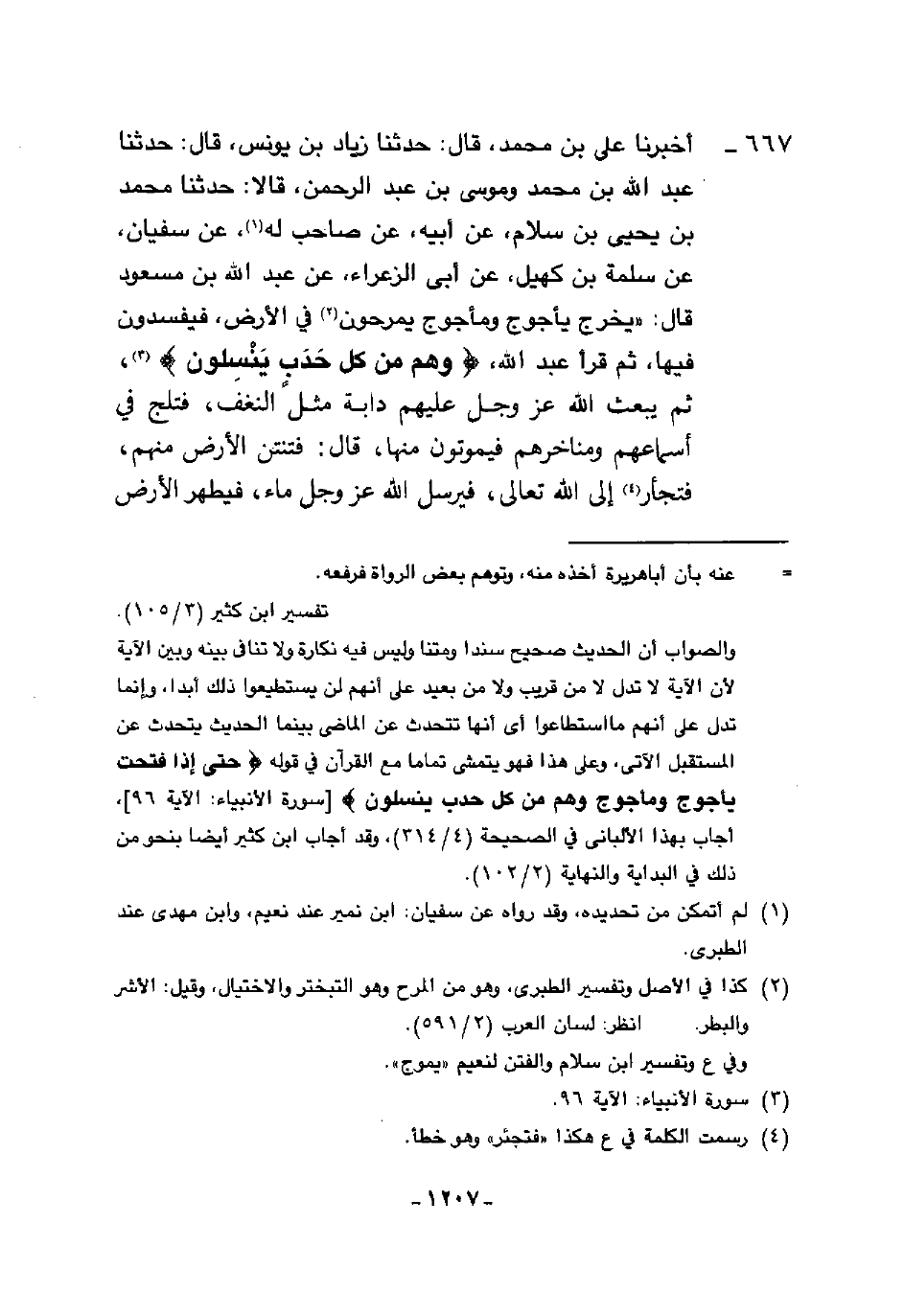 667 - أَخْبَرَنَا عَلِيُّ بْنُ مُحَمَّدٍ، قَالَ: حَدَّثَنَا زِيَادُ بْنُ يُونُسَ، قَالَ: حَدَّثَنَا عَبْدُ اللَّهِ بْنُ مُحَمَّدٍ، وَمُوسَى بْنُ عَبْدِ الرَّحْمَنِ، قَالَا: حَدَّثَنَا مُحَمَّدُ بْنُ يَحْيَى بْنِ سَلَّامٍ، عَنْ أَبِيهِ، عَنْ صَاحِبٍ، لَهُ عَنْ سُفْيَانَ، عَنْ سَلَمَةَ بْنِ كُهَيْلٍ، عَنْ أَبِي الزَّعْرَاءِ، عَنْ عَبْدِ اللَّهِ بْنِ مَسْعُودٍ، قَالَ: §«يَخْرُجُ يَأْجُوجُ وَمَأْجُوجُ يَمْرَحُونَ فِي الْأَرْضِ فَيُفْسِدُونَ» فِيهَا ثُمَّ قَرَأَ عَبْدُ اللَّهِ {وَهُمْ مِنْ كُلِّ حَدَبٍ يَنْسِلُونَ} [الأنبياء: 96] ثُمَّ يَبْعَثُ اللَّهُ عَزَّ وَجَلَّ عَلَيْهِمْ دَابَّةً مِثْلَ النَّغَفِ فَتَلِجُ فِي أَسْمَاعِهِمْ وَمَنَاخِرِهِمْ فَيَمُوتُونَ مِنْهَا "، قَالَ: «فَتُنْتِنُ الْأَرْضُ مِنْهُمْ فَتَجْأَرُ إِلَى اللَّهِ تَعَالَى فَيُرْسِلُ اللَّهُ عَزَّ وَجَلَّ مَاءً فَيُطَهَّرُ الْأَرْضَ -[1208]- مِنْهُمْ»