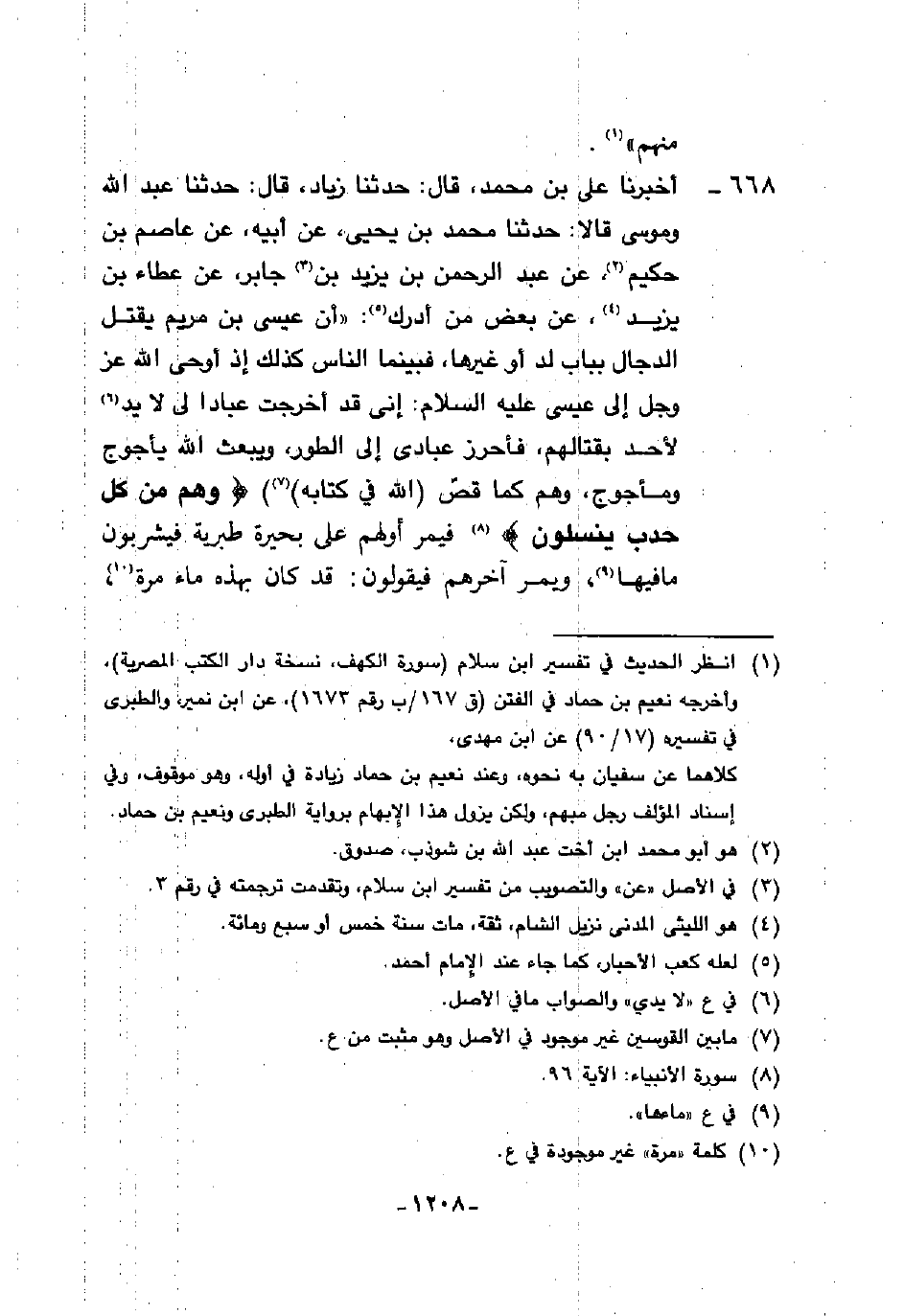 668 - أَخْبَرَنَا عَلِيُّ بْنُ مُحَمَّدٍ، قَالَ: حَدَّثَنَا زِيَادٌ، قَالَ: حَدَّثَنَا عَبْدُ اللَّهِ، وَمُوسَى، قَالَا: حَدَّثَنَا مُحَمَّدُ بْنُ يَحْيَى، عَنْ أَبِيهِ، عَنْ عَاصِمِ بْنِ حَكِيمٍ، عَنْ عَبْدِ الرَّحْمَنِ بْنِ يَزِيدَ بْنِ جَابِرٍ، عَنْ عَطَاءِ بْنِ يَزِيدَ، عَنْ بَعْضِ مَنْ أَدْرَكَ: " أَنَّ §عِيسَى ابْنَ مَرْيَمَ، يَقْتُلُ الدَّجَّالَ بِبَابِ لُدٍّ أَوْ غَيْرِهَا فَبَيْنَمَا النَّاسُ كَذَلِكَ إِذْ أَوْحَى اللَّهُ عَزَّ وَجَلَّ إِلَى عِيسَى عَلَيْهِ السَّلَامُ إِنَّى قَدْ أَخْرَجْتُ عِبَادًا لِي لَا يَدَ لِأَحَدٍ بِقِتَالِهِمْ فَأَحْرِزْ عِبَادِي إِلَى الطُّورِ، وَيَبْعَثُ اللَّهُ يَأْجُوجَ وَمَأْجُوجَ وَهُمْ كَمَا قَصَّ اللَّهُ فِي كِتَابِهِ {وَهُمْ مِنْ كُلِّ حَدَبٍ يَنْسِلُونَ} [الأنبياء: 96] فَيَمُرُّ أَوَّلُهُمْ عَلَى بُحَيْرَةِ طَبَرِيَّةَ فَيَشْرَبُونَ مَا فِيهَا، وَيَمُرُّ آخِرُهُمْ فَيَقُولُونَ: قَدْ كَانَ بِهَذِهِ مَاءٌ مَرَّةً -[1209]-، وَيَسِيرُونَ حَتَّى يَنْتَهُوا إِلَى جَبَلِ الْخُمْرَةِ لَا يَعُدُونَهُ فَيَقُولُ بَعْضُهُمْ لِبَعْضٍ: قَدْ قَتَلْنَا مَنْ فِي الْأَرْضِ إِلَّا مَنْ دَانَ لَنَا فَهَلُمُّوا فَنَقْتُلُ مَنْ فِي السَّمَاءِ فَيَرْمُونَ نُشَّابَهُمْ نَحْوَ السَّمَاءِ فَيَرُدُّهَا اللَّهُ عَزَّ وَجَلَّ مَخْضُوبَةً دَمًا وَيَحْصُرُونَ نَبِيَّ اللَّهِ عِيسَى وَأَصْحَابَهُ، فَبَيْنَمَا هُمْ كَذَلِكَ إِذْ رَغِبُوا إِلَى اللَّهِ عَزَّ وَجَلَّ فَأَرْسَلَ عَلَيْهِمُ النَّغَفَ فِي رِقَابِهِمْ فَيُصْبِحُونَ فَرْسَى كَمَوْتِ نَفْسٍ وَاحِدَةٍ، وَيَهْبِطُ نَبِيُّ اللَّهِ وَأَصْحَابُهُ فَلَا يَجِدُونَ فِي الْأَرْضِ مَوْضِعَ شِبْرٍ إِلَّا مَلَأَهُ زَهَمُهُمْ وَنَتْنُهُمْ وَدِمَاؤُهُمْ فَيَرْغَبُ عِيسَى عَلَيْهِ السَّلَامُ وَمَنْ مَعَهُ إِلَى اللَّهِ عَزَّ وَجَلَّ فَيُرْسِلُ عَلَيْهِمْ طَيْرًا -[1210]- كَأَعْنَاقِ الْبُخْتِ فَيُلْقِيهِمْ فِي الْمُهَبَّلُ " قُلْتُ: يَا أَبَا يَزِيدَ: وَأَيْنَ الْمُهَبَّلُ؟ قَالَ: مَطْلِعُ الشَّمْسِ
