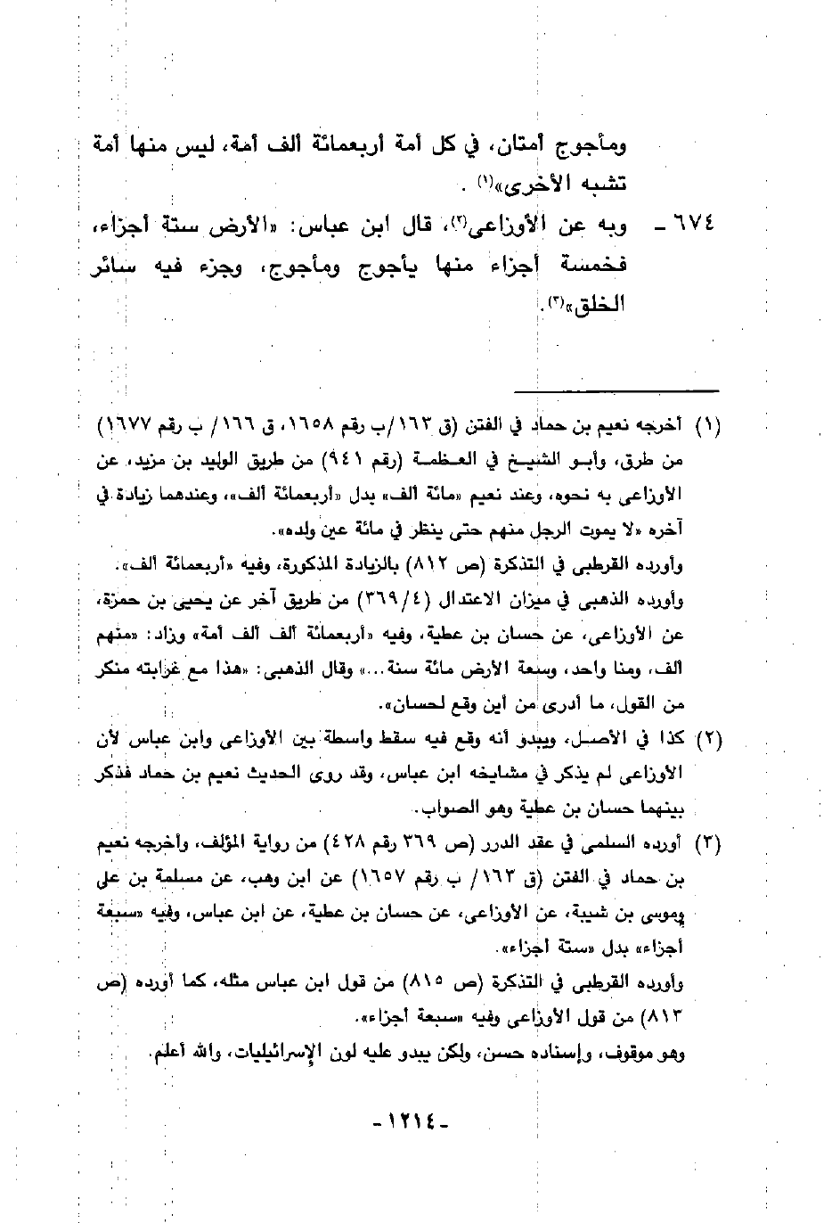 674 - وَبِهِ عَنِ الْأَوْزَاعِيِّ، قَالَ ابْنُ عَبَّاسٍ: «§الْأَرْضُ سِتَّةُ أَجْزَاءٍ، فَخَمْسَةُ أَجْزَاءٍ مِنْهَا يَأْجُوجُ وَمَأْجُوجُ، وَجُزْءٌ فِيهِ سَائِرُ الْخَلْقِ»