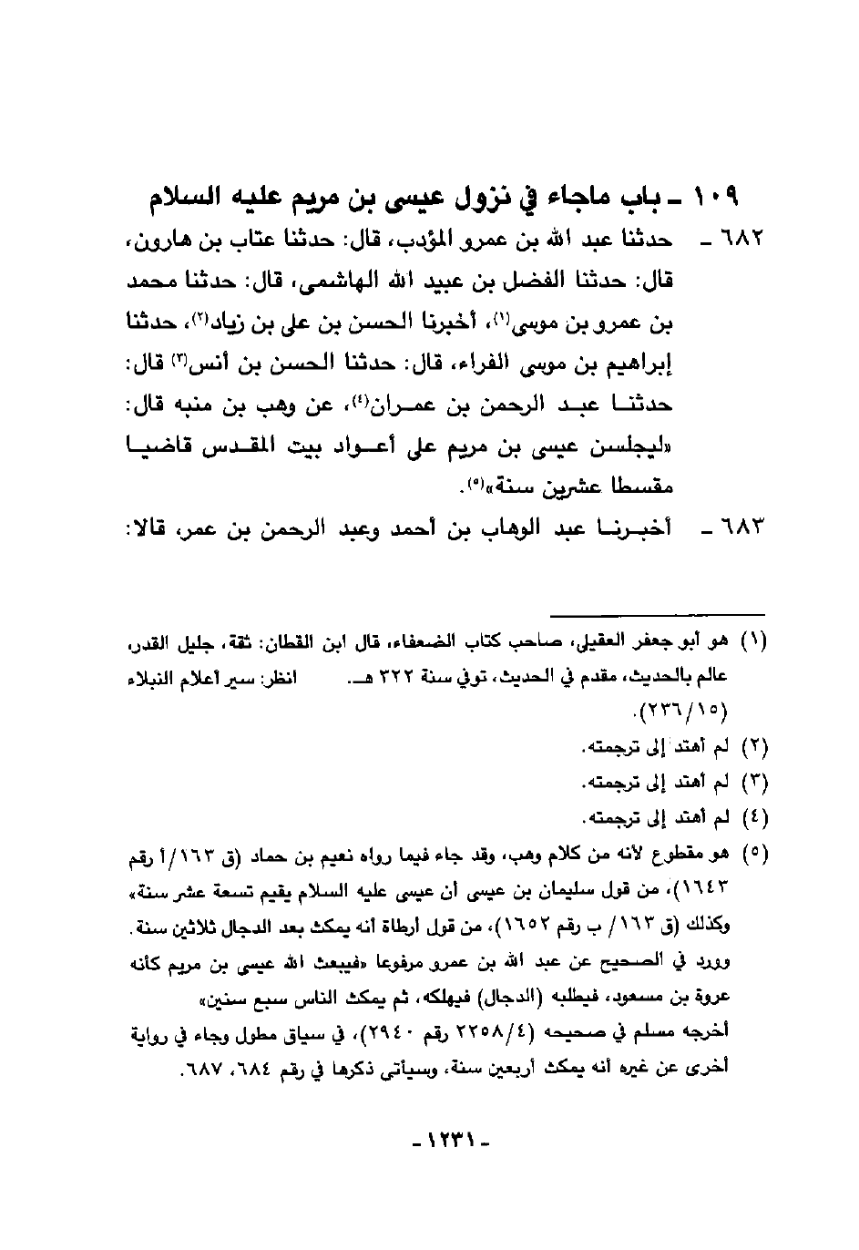 682 - حَدَّثَنَا عَبْدُ اللَّهِ بْنُ عَمْرٍو الْمُؤَدِّبُ، قَالَ: حَدَّثَنَا عَتَّابُ بْنُ هَارُونَ، قَالَ: حَدَّثَنَا الْفَضْلُ بْنُ عُبَيْدِ اللَّهِ الْهَاشِمِيُّ، قَالَ: حَدَّثَنَا مُحَمَّدُ بْنُ عَمْرِو بْنِ مُوسَى، أَخْبَرَنَا الْحَسَنُ بْنُ عَلِيِّ بْنِ زِيَادٍ، حَدَّثَنَا إِبْرَاهِيمُ بْنُ مُوسَى الْفَرَّاءُ، قَالَ: حَدَّثَنَا الْحَسَنُ بْنُ أَنَسٍ، قَالَ: حَدَّثَنَا عَبْدُ الرَّحْمَنِ بْنُ عِمْرَانَ، عَنْ وَهْبِ بْنِ مُنَبِّهٍ، قَالَ: §«لَيَجْلِسَنَّ عِيسَى ابْنُ مَرْيَمَ عَلَى أَعْوَادِ بَيْتِ الْمَقْدِسِ قَاضِيًا مُقْسِطًا عِشْرِينَ سَنَةً»