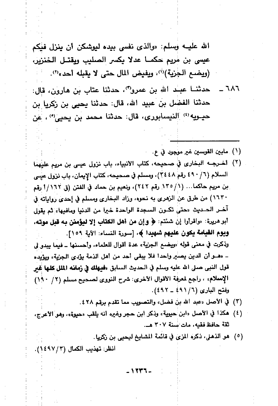 686 - حَدَّثَنَا عَبْدُ اللَّهِ بْنُ عَمْرٍو، حَدَّثَنَا عَتَّابُ بْنُ هَارُونَ، قَالَ: حَدَّثَنَا الْفَضْلُ بْنُ عُبَيْدِ اللَّهِ، قَالَ: حَدَّثَنَا يَحْيَى بْنُ زَكَرِيَّا بْنِ حَيَّوَيْهِ النَّيْسَابُورِيُّ، قَالَ: حَدَّثَنَا مُحَمَّدُ بْنُ يَحْيَى، عَنْ -[1237]- مُحَمَّدِ بْنِ مَسْلَمَةَ، عَنْ أَبِي الْوَاصِلِ بْنِ عُبَيْدٍ، قَالَ: قَالَ جَابِرُ بْنُ عَبْدِ اللَّهِ، قَالَ رَسُولُ اللَّهِ صَلَّى اللهُ عَلَيْهِ وَسَلَّمَ: §" لَا تَزَالُ طَائِفَةٌ مِنْ أُمَّتِي تُقَاتِلُ عَنِ الْحَقِّ حَتَّى يَنْزِلَ عِيسَى ابْنُ مَرْيَمَ عِنْدَ طُلُوعِ الْفَجْرِ بِبَيْتِ الْمَقْدِسِ، يَنْزِلُ عَلَى الْمَهْدِيِّ، فَيُقَالُ لَهُ: تَقَدَّمْ يَا نَبِيَّ اللَّهِ فَصَلِّ لَنَا، فَيَقُولُ: إِنَّ هَذِهِ الْأُمَّةُ أَمِينٌ بَعْضُهُمْ عَلَى بَعْضٍ لِكَرَامَتِهِمْ عَلَى اللَّهِ عَزَّ وَجَلَّ "