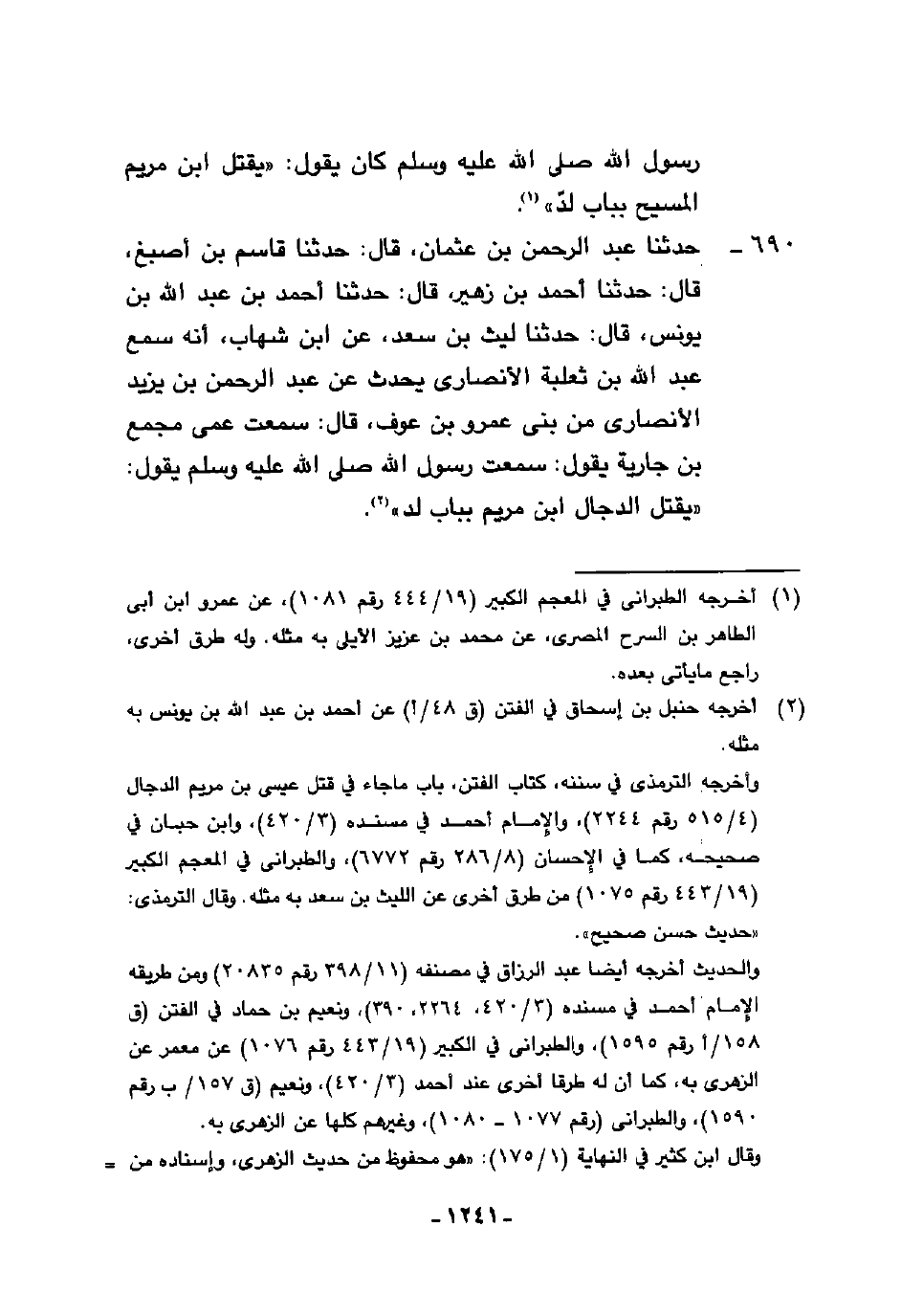 690 - حَدَّثَنَا عَبْدُ الرَّحْمَنِ بْنُ عُثْمَانَ، قَالَ: حَدَّثَنَا قَاسِمُ بْنُ أَصْبَغَ، قَالَ: حَدَّثَنَا أَحْمَدُ بْنُ زُهَيْرٍ، قَالَ: حَدَّثَنَا أَحْمَدُ بْنُ عَبْدِ اللَّهِ بْنِ يُونُسَ، قَالَ: حَدَّثَنَا لَيْثُ بْنُ سَعْدٍ، عَنِ ابْنِ شِهَابٍ، أَنَّهُ سَمِعَ عَبْدَ اللَّهِ بْنَ ثَعْلَبَةَ الْأَنْصَارِيَّ، يُحَدِّثُ عَنْ عَبْدِ الرَّحْمَنِ بْنِ يَزِيدَ الْأَنْصَارِيِّ، مِنْ بَنِي عَمْرِو بْنِ عَوْفٍ، قَالَ: سَمِعْتُ عَمِّي مُجَمِّعَ بْنَ جَارِيَةَ، يَقُولُ: سَمِعْتُ رَسُولَ اللَّهِ صَلَّى اللهُ عَلَيْهِ وَسَلَّمَ، يَقُولُ: §«يَقْتُلُ الدَّجَّالَ ابْنُ مَرْيَمَ بِبَابِ لُدٍّ»