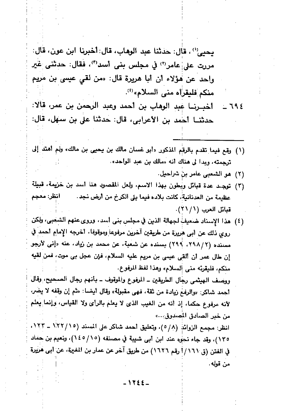694 - أَخْبَرَنَا عَبْدُ الْوَهَّابِ بْنُ أَحْمَدَ، وعَبْدُ الرَّحْمَنِ بْنُ عُمَرَ، قَالَا: حَدَّثَنَا أَحْمَدُ بْنُ الْأَعْرَابِيِّ، قَالَ: حَدَّثَنَا عَلِيُّ بْنُ سَهْلٍ، قَالَ -[1245]-: حَدَّثَنَا الْحَارِثُ بْنُ سُلَيْمَانَ، قَالَ: حَدَّثَنَا عُقْبَةُ بْنُ عَلْقَمَةَ، عَنِ الْأَوْزَاعِيِّ، عَنْ حَنْظَلَةَ بْنِ عَلِيٍّ، عَنْ أَبِي هُرَيْرَةَ، رَضِيَ اللَّهُ عَنْهُ أَنَّ رَسُولَ اللَّهِ صَلَّى اللهُ عَلَيْهِ وَسَلَّمَ كَانَ يَقُولُ: «وَالَّذِي نَفْسِي بِيَدِهِ §لَيُهِلَّنَّ ابْنُ مَرْيَمَ بِفَجِّ الرَّوْحَاءِ حَاجًّا أَوْ مُعْتَمِرًا أَوْ لَيُثَنِّيَنَّهُمَا» يَعْنِي يَقْرِنُهُمَا