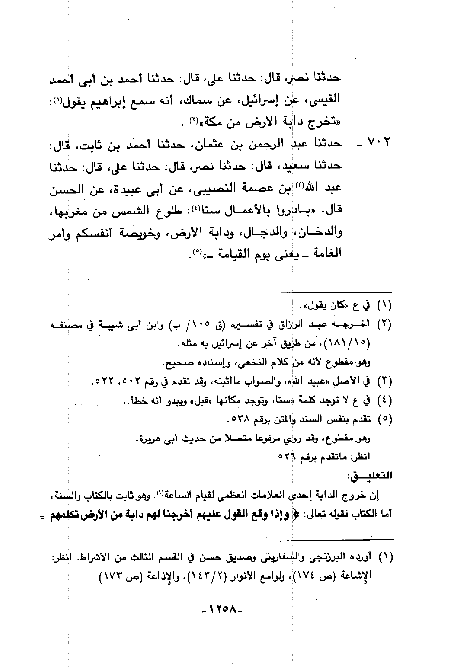 702 - حَدَّثَنَا عَبْدُ الرَّحْمَنِ بْنُ عُثْمَانَ، حَدَّثَنَا أَحْمَدُ بْنُ ثَابِتٍ، قَالَ: حَدَّثَنَا سَعِيدٌ، قَالَ: حَدَّثَنَا نَصْرٌ، قَالَ: حَدَّثَنَا عَلِيٌّ، قَالَ: حَدَّثَنَا عَبْدُ اللَّهِ بْنُ عِصْمَةَ النَّصِيبِيُّ، عَنْ أَبِي عُبَيْدَةَ، عَنِ الْحَسَنِ، قَالَ: " §بَادِرُوا بِالْأَعْمَالِ سِتًّا: طُلُوعَ الشَّمْسِ مِنْ مَغْرِبِهَا، وَالدُّخَانَ، وَالدَّجَّالَ، وَدَابَّةَ الْأَرْضِ، وَخُوَيِّصَةَ أَنْفُسِكُمْ، وَأَمْرَ الْعَامَّةِ " يَعْنِي يَوْمَ الْقِيَامَةِ