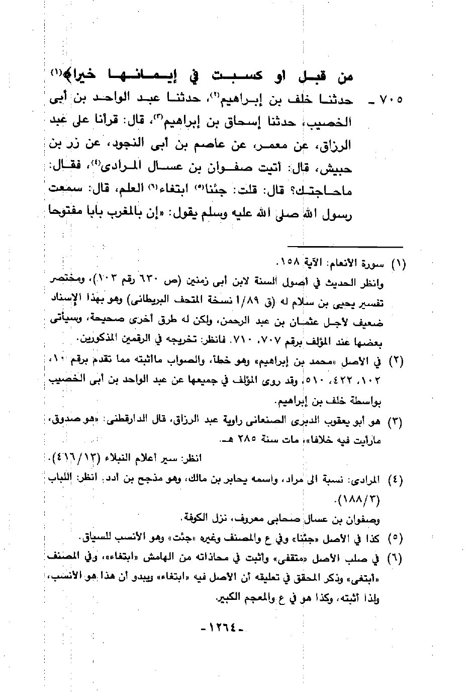 705 - حَدَّثَنَا خَلَفُ بْنُ إِبْرَاهِيمَ، حَدَّثَنَا عَبْدُ الْوَاحِدِ بْنُ أَبِي الْخَصِيبِ، حَدَّثَنَا إِسْحَاقُ بْنُ إِبْرَاهِيمَ، قَالَ: قَرَأْنَا عَلَى عَبْدِ الرَّزَّاقِ، عَنْ مَعْمَرٍ، عَنْ عَاصِمِ بْنِ أَبِي النَّجُودِ، عَنْ زِرِّ بْنِ حُبَيْشٍ، قَالَ: أَتَيْتُ صَفْوَانَ بْنَ عَسَّالٍ الْمُرَادِيَّ فَقَالَ: مَا حَاجَتُكَ؟ قَالَ: قُلْتُ: جِئْنَا ابْتِغَاءَ الْعِلْمِ، قَالَ: سَمِعْتُ رَسُولَ اللَّهِ صَلَّى اللهُ عَلَيْهِ وَسَلَّمَ، يَقُولُ: «إِنَّ §بِالْمَغْرِبِ بَابًا مَفْتُوحًا -[1265]- لِلتَّوْبَةِ مَسِيرَةَ سَبْعِينَ سَنَةً لَا يُغْلَقُ حَتَّى تَطْلُعَ الشَّمْسُ مِنْ مَغْرِبِهَا مِنْ نَحْوِهِ»