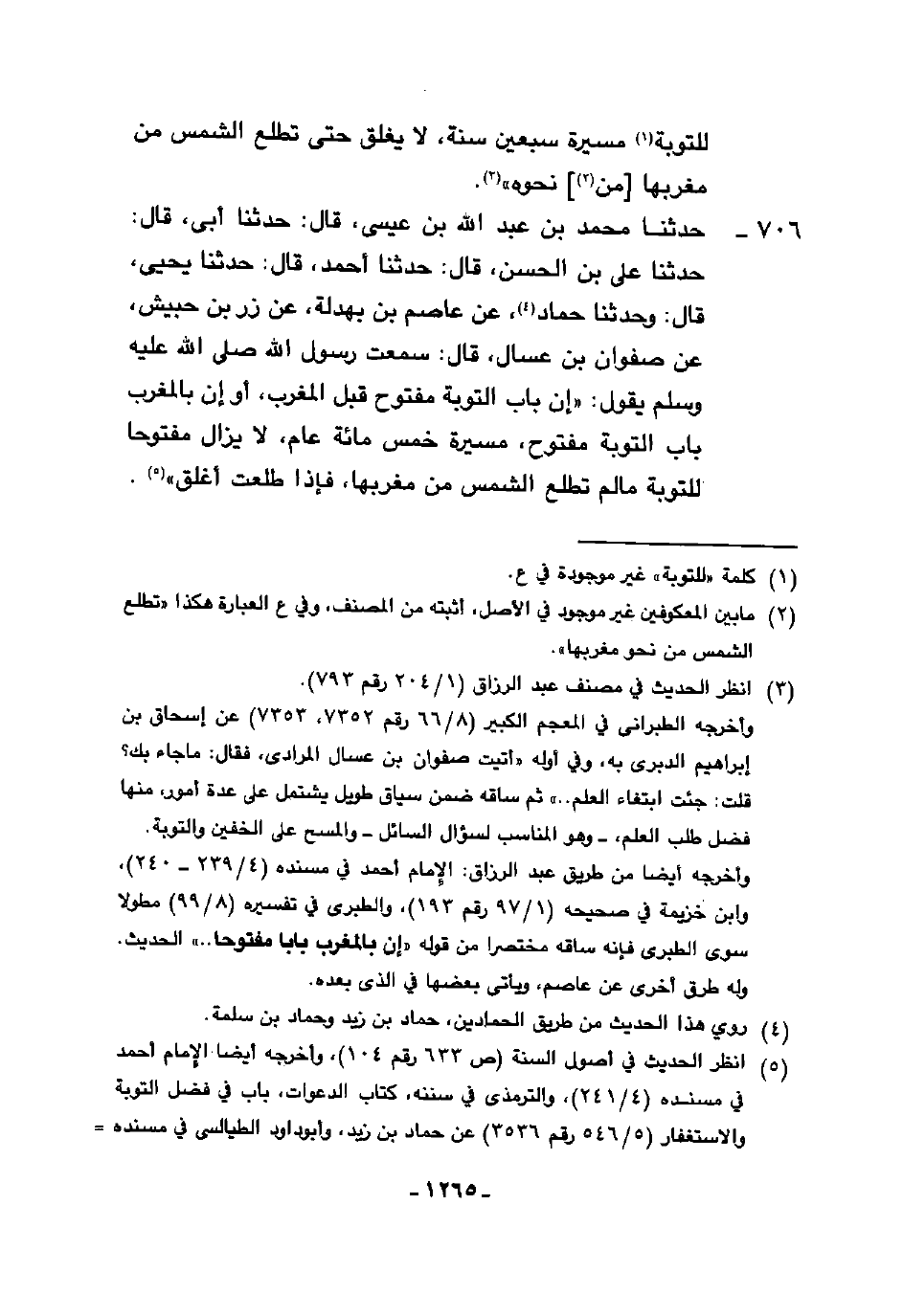 706 - حَدَّثَنَا مُحَمَّدُ بْنُ عَبْدِ اللَّهِ بْنِ عِيسَى، قَالَ: حَدَّثَنَا أَبِي قَالَ: حَدَّثَنَا عَلِيُّ بْنُ الْحَسَنِ، قَالَ: حَدَّثَنَا أَحْمَدُ، قَالَ: حَدَّثَنَا يَحْيَى، قَالَ: وَحَدَّثَنَا حَمَّادٌ، عَنْ عَاصِمِ ابْنِ بَهْدَلَةَ، عَنْ زِرِّ بْنِ حُبَيْشٍ، عَنْ صَفْوَانَ بْنِ عَسَّالٍ، قَالَ: سَمِعْتُ رَسُولَ اللَّهِ صَلَّى اللهُ عَلَيْهِ وَسَلَّمَ، يَقُولُ: «إِنَّ §بَابَ التَّوْبَةِ مَفْتُوحٌ قِبَلِ الْمَغْرِبِ - أَوْ إِنَّ بِالْمَغْرِبِ بَابَ التَّوْبَةِ مَفْتُوحٌ مَسِيرَةَ خَمْسِ مِائَةِ عَامٍ - لَا يَزَالُ مَفْتُوحًا لِلتَّوْبَةِ مَا لَمْ تَطْلُعِ الشَّمْسُ مِنْ مَغْرِبِهَا فَإِذَا طَلَعَتْ أُغْلِقَ»