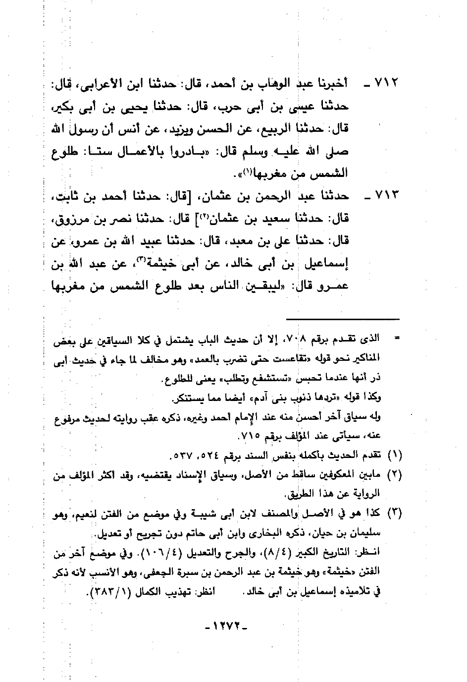 713 - حَدَّثَنَا عَبْدُ الرَّحْمَنِ بْنُ عُثْمَانَ، قَالَ: حَدَّثَنَا أَحْمَدُ بْنُ ثَابِتٍ، قَالَ: حَدَّثَنَا سَعِيدُ بْنُ عُثْمَانَ، قَالَ: حَدَّثَنَا نَصْرُ بْنُ مَرْزُوقٍ، قَالَ: حَدَّثَنَا عَلِيُّ بْنُ مَعَبْدٍ، قَالَ: حَدَّثَنَا عُبَيْدُ اللَّهِ بْنُ عَمْرٍو، عَنْ إِسْمَاعِيلَ بْنِ أَبِي خَالِدٍ، عَنْ أَبِي خَيْثَمَةَ، عَنْ عَبْدِ اللَّهِ بْنِ عَمْرٍو، قَالَ: §«لَيَبْقَيَنَّ النَّاسُ بَعْدَ طُلُوعِ الشَّمْسِ مِنْ مَغْرِبِهَا -[1273]- عِشْرِينَ وَمِائَةَ سَنَةٍ»