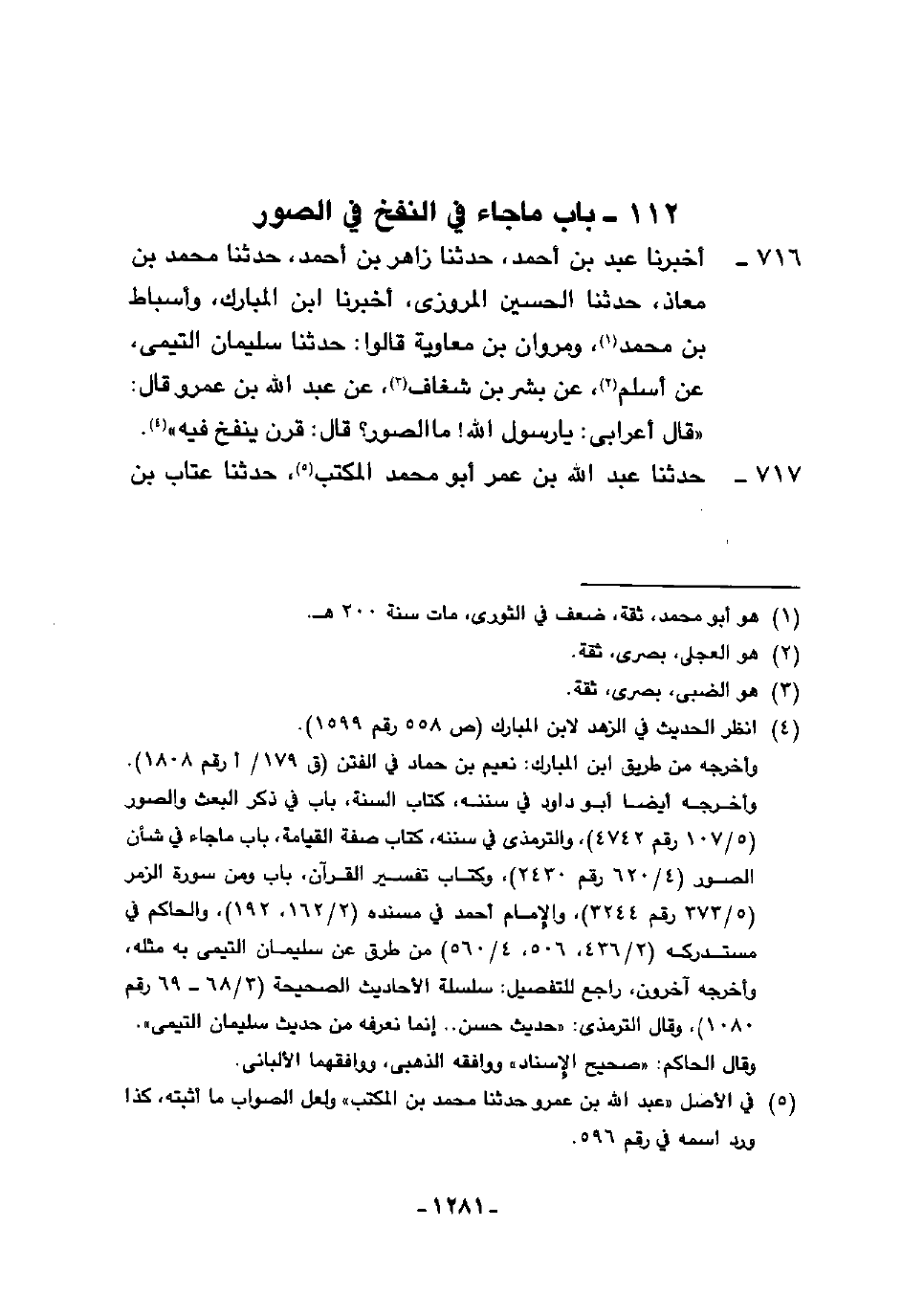 716 - أَخْبَرَنَا عَبْدُ بْنُ أَحْمَدَ، حَدَّثَنَا أَزْهَرُ بْنُ أَحْمَدَ، حَدَّثَنَا مُحَمَّدُ بْنُ مُعَاذٍ، حَدَّثَنَا الْحُسَيْنُ الْمَرْوَزِيُّ، أَخْبَرَنَا ابْنُ الْمُبَارَكِ، وَأَسْبَاطُ بْنُ مُحَمَّدٍ، وَمَرْوَانُ بْنُ مُعَاوِيَةَ، قَالُوا: حَدَّثَنَا سُلَيْمَانُ التَّيْمِيُّ، عَنْ أَسْلَمَ، عَنْ بِشْرِ بْنِ شَغَافٍ، عَنْ عَبْدِ اللَّهِ بْنِ عَمْرٍو، قَالَ: قَالَ أَعْرَابِيٌّ: يَا رَسُولَ اللَّهِ §مَا الصُّورُ؟ قَالَ: «قَرْنٌ يُنْفَخُ فِيهِ»