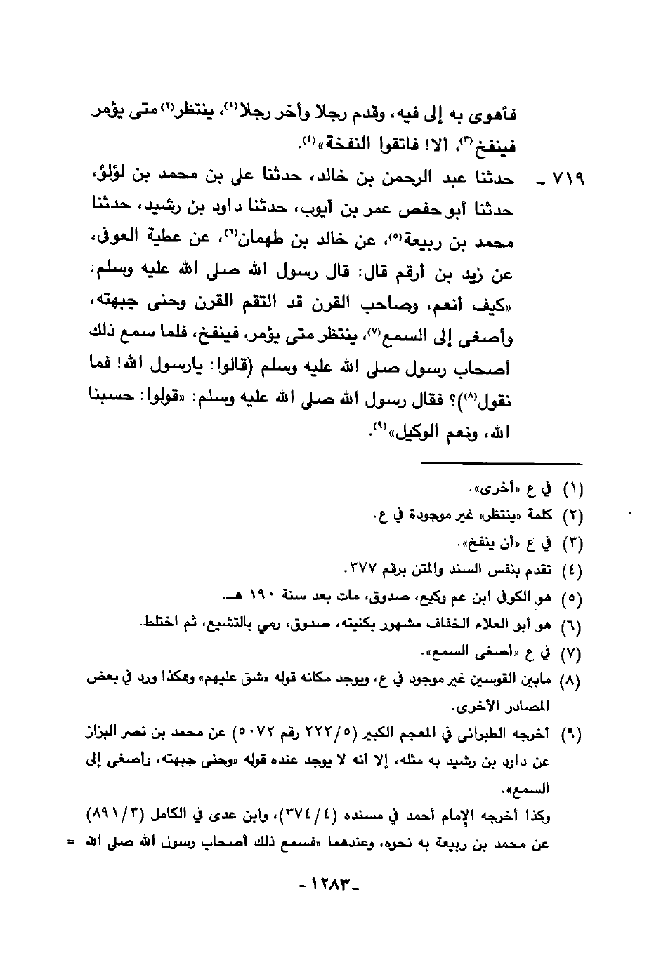 719 - حَدَّثَنَا عَبْدُ الرَّحْمَنِ بْنُ خَالِدٍ، حَدَّثَنَا عَلِيُّ بْنُ مُحَمَّدِ بْنِ لُؤْلُؤٍ، حَدَّثَنَا أَبُو حَفْصٍ، عُمَرُ بْنُ أَيُّوبَ، حَدَّثَنَا دَاوُدُ بْنُ رُشَيْدٍ، حَدَّثَنَا مُحَمَّدُ بْنُ رَبِيعَةَ، عَنْ خَالِدِ بْنِ طَهْمَانَ، عَنْ عَطِيَّةَ الْعَوْفِيِّ، عَنْ زَيْدِ بْنِ أَرْقَمَ، قَالَ: قَالَ رَسُولُ اللَّهِ صَلَّى اللهُ عَلَيْهِ وَسَلَّمَ: §«كَيْفَ أَنْعَمُ وَصَاحِبُ الْقَرْنِ قَدِ الْتَقَمَ الْقَرْنَ وَحَنَى جَبْهَتَهُ وَأَصْغَى إِلَى السَّمْعِ يَنْتَظِرُ مَتَى يُؤْمَرُ فَيَنْفُخَ» فَلَمَّا سَمِعَ ذَلِكَ أَصْحَابُ رَسُولِ اللَّهِ صَلَّى اللهُ عَلَيْهِ وَسَلَّمَ، قَالُوا: يَا رَسُولَ اللَّهِ فَمَا نَقُولُ؟ فَقَالَ رَسُولُ اللَّهِ صَلَّى اللهُ عَلَيْهِ وَسَلَّمَ: «قُولُوا حَسْبُنَا اللَّهُ وَنِعْمَ الْوَكِيلُ»