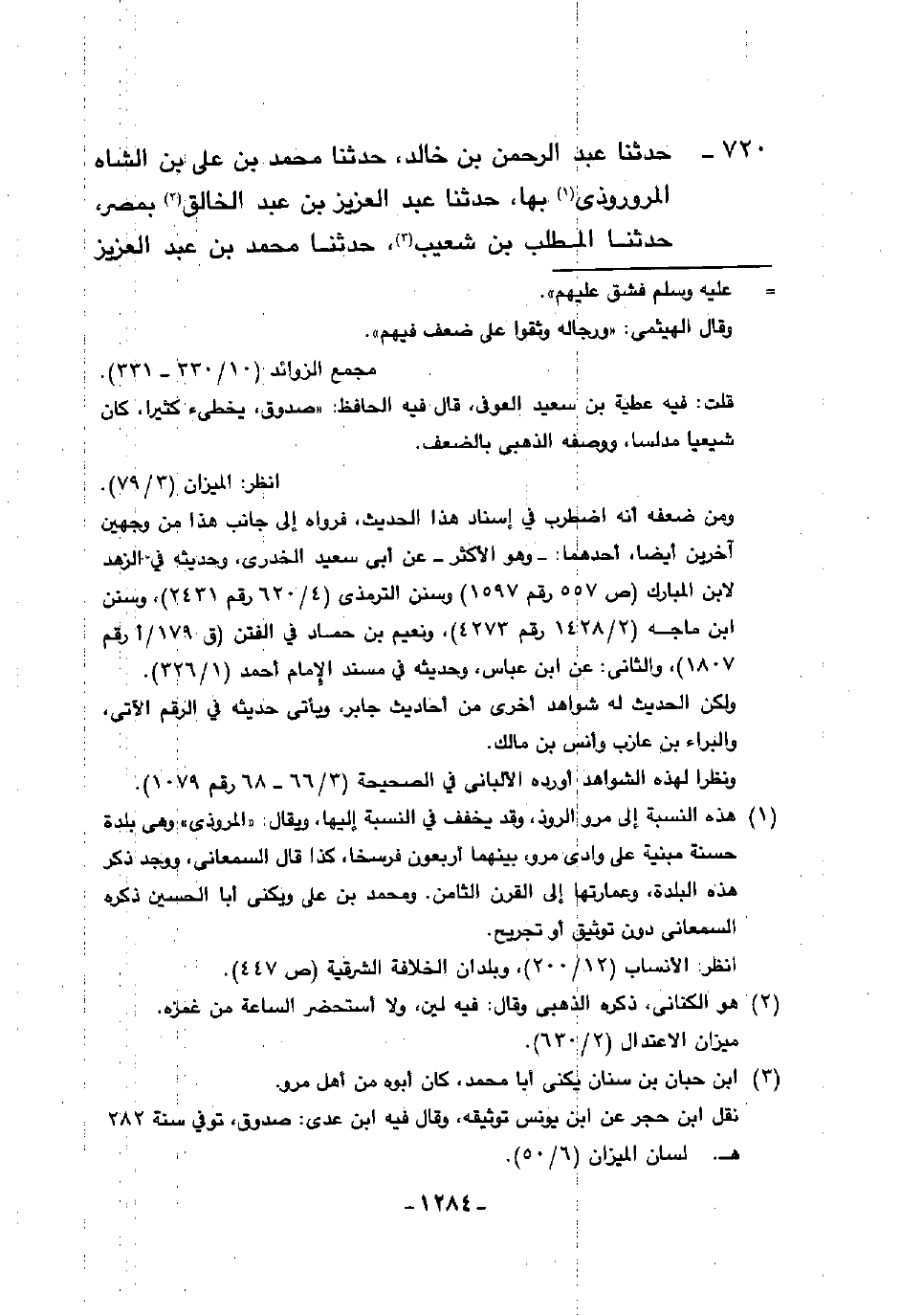 720 - حَدَّثَنَا عَبْدُ الرَّحْمَنِ بْنُ خَالِدٍ، حَدَّثَنَا مُحَمَّدُ بْنُ عَلِيِّ بْنِ الشَّاهِ الْمَرْوَزِيُّ، بِهَا، حَدَّثَنَا عَبْدُ الْعَزِيزِ بْنِ عَبْدِ الْخَالِقِ، بِمِصْرَ، حَدَّثَنَا الْمُطَّلِبُ بْنُ شُعَيْبٍ، حَدَّثَنَا مُحَمَّدُ بْنُ عَبْدِ الْعَزِيزِ -[1285]- الْوَاسِطِيُّ، حَدَّثَنَا مُحَمَّدُ بْنُ يُوسُفَ، حَدَّثَنَا سُفْيَانُ الثَّوْرِيُّ، عَنْ جَعْفَرِ بْنِ مُحَمَّدٍ، عَنْ أَبِيهِ، عَنْ جَابِرٍ، قَالَ: قَالَ رَسُولُ اللَّهِ صَلَّى اللهُ عَلَيْهِ وَسَلَّمَ: §«كَيْفَ أَنْعَمُ وَصَاحِبُ الصُّورِ قَدِ الْتَقَمَهُ وَحَنَى ظَهْرَهُ وَأَصْغَى سَمْعَهُ يَنْتَظِرُ مَتَى يُؤْمَرُ فَيَنْفُخَ» قَالَ: قُلْنَا: يَا رَسُولَ اللَّهِ فَمَا تَأْمُرُنَا؟ قَالَ: «قُولُوا حَسْبُنَا اللَّهُ وَنِعْمَ الْوَكِيلُ»