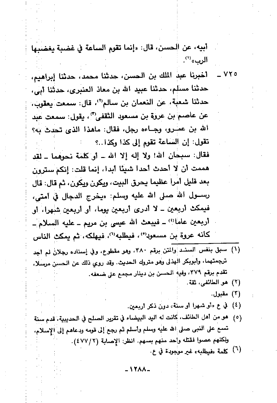 725 - أَخْبَرَنَا عَبْدُ الْمَلِكِ بْنُ الْحَسَنِ، حَدَّثَنَا مُحَمَّدٌ، حَدَّثَنَا إِبْرَاهِيمُ، حَدَّثَنَا مُسْلِمٌ، حَدَّثَنَا عُبَيْدُ اللَّهِ بْنُ مُعَاذٍ الْعَنْبَرِيُّ، حَدَّثَنَا أَبِي، حَدَّثَنَا شُعْبَةُ، عَنِ النُّعْمَانِ بْنِ سَالِمٍ، قَالَ: سَمِعْتُ يَعْقُوبَ بْنَ عَاصِمِ بْنِ عُرْوَةَ بْنِ مَسْعُودٍ الثَّقَفِيِّ، يَقُولُ: سَمِعْتُ عَبْدَ اللَّهِ بْنَ عَمْرٍو، وَجَاءَهُ رَجُلٌ، فَقَالَ: مَا هَذَا الَّذِي تُحَدِّثُ بِهِ؟ تَقُولُ إِنَّ السَّاعَةَ تَقُومُ إِلَى كَذَا وَكَذَا، فَقَالَ: سُبْحَانَ اللَّهِ وَلَا إِلَهَ إِلَّا اللَّهُ - أَوْ كَلِمَةً نَحْوَهُمَا - لَقَدْ هَمَمْتُ أَنْ لَا أُحَدِّثَ أَحَدًا شَيْئًا أَبَدًا إِنَّمَا قُلْتُ إِنَّكُمْ سَتَرَوْنَ بَعْدَ قَلِيلٍ أَمْرًا عَظِيمًا، يُحْرِقُ الْبَيْتَ وَيَكُونُ وَيَكُونُ، ثُمَّ قَالَ: قَالَ رَسُولُ اللَّهِ صَلَّى اللهُ عَلَيْهِ وَسَلَّمَ: §«يَخْرُجُ الدَّجَّالُ فِي أُمَّتِي فَيَمْكُثُ أَرْبَعِينَ لَا أَدْرِي أَرْبَعِينَ يَوْمًا أَوْ أَرْبَعِينَ شَهْرًا أَوْ أَرْبَعِينَ عَامًا فَيَبْعَثُ اللَّهُ عِيسَى ابْنَ مَرْيَمَ عَلَيْهِ السَّلَامُ كَأَنَّهُ عُرْوَةُ بْنُ مَسْعُودٍ فَيَطْلُبُهُ فَيُهْلِكُهُ، ثُمَّ يَمْكُثُ النَّاسُ -[1289]- سَبْعَ سِنِينَ لَيْسَ بَيْنَ اثْنَيْنِ عَدَاوَةٌ، ثُمَّ يُرْسِلُ اللَّهُ رِيحًا بَارِدَةً مِنْ قِبَلِ الشَّامِ فَلَا يَبْقَى عَلَى وَجْهِ الْأَرْضِ أَحَدٌ فِي قَلْبِهِ مِثْقَالُ حَبَّةٍ مِنْ خَيْرٍ مِنْ إِيمَانٍ إِلَّا قَبْضَتْهُ حَتَّى لَوْ أَنَّ أَحَدَكُمْ دَخَلَ فِي كَبِدِ جَبَلٍ لَدَخَلَتْهُ عَلَيْهِ حَتَّى تَقْبِضَهُ» قَالَ: سَمِعْتُهَا مِنْ رَسُولِ اللَّهِ صَلَّى اللهُ عَلَيْهِ وَسَلَّمَ، قَالَ: " فَيَبْقَى شِرَارُ النَّاسِ فِي خِفَّةِ الطَّيْرِ وَأَحْلَامِ السِّبَاعِ لَا يَعْرِفُونَ مَعْرُوفًا وَلَا يُنْكِرُونَ مُنْكَرًا فَيَتَمَثَّلُ لَهُمُ الشَّيْطَانُ فَيَقُولُ: أَلَا تَسْتَجِيبُونَ؟ فَيَقُولُونَ: فَمَا تَأْمُرُنَا فَيَأْمُرُهُمْ بِعِبَادَةِ الْأَوْثَانِ وَهُمْ فِي ذَلِكَ دَارٌّ رِزْقُهُمْ حَسَنٌ عَيْشُهُمْ، ثُمَّ يُنْفَخُ فِي الصُّورِ فَلَا يَسْمَعُهُ أَحَدٌ إِلَّا أَصْغَى لِيتًا وَرَفَعَ لِيتًا " قَالَ: «وَأَوَّلُ مَنْ يَسْمَعُهُ رَجُلٌ يَلِيطُ حَوْضَ إِبِلِهِ» قَالَ: " فَيَصْعَقُ وَيَصْعَقُ النَّاسُ ثُمَّ يُرْسِلُ اللَّهُ - أَوْ -[1290]- قَالَ: يُنْزِلُ اللَّهُ - مَطَرًا كَأَنَّهُ الطَّلُّ - أَوِ الظِّلُّ نُعْمَانُ الشَّاكُّ - فَتَنْبُتُ مِنْهُ أَجْسَادُ النَّاسِ، ثُمَّ يُنْفَخُ فِيهِ أُخْرَى فَإِذَا هُمْ قِيَامٌ يَنْظُرُونَ، ثُمَّ يُقَالُ: يَا أَيُّهَا النَّاسُ هَلُمُّوا إِلَى رَبِّكُمْ وَقِفُوهُمْ إِنَّهُمْ مَسْئُولُونَ " قَالَ: " ثُمَّ يُقَالُ: أَخْرِجُوا بَعْثَ النَّارِ، فَيُقَالُ: مِنْ كَمْ؟ فَيُقَالُ: مِنْ كُلِّ أَلْفٍ تِسْعَمِائَةٍ وَتِسْعَةً وَتِسْعِينَ " قَالَ: «فَذَاكَ يَوْمٌ يَجْعَلُ الْوِلْدَانَ شِيبًا وَذَلِكَ يَوْمَ يُكْشَفُ عَنْ سَاقٍ» قَالَ عُثْمَانُ بْنُ سَعِيدٍ: فِيمَا أَمْلَيْنَاهُ مِنَ الْآثَارِ وَالسُّنَنِ فِي الْمَعْنَى الَّذِي قَصَدْنَا لَهُ كِفَايَةٌ وَمَقْنَعٌ وَنَسْأَلُ اللَّهَ التَّوْفِيقَ وَالْهُدَى وَالْعِصْمَةَ مِنَ الزَّلَلِ وَالْخَطَأِ وَأَنْ يُقَرِّبَنَا إِلَيْهِ زُلْفَى