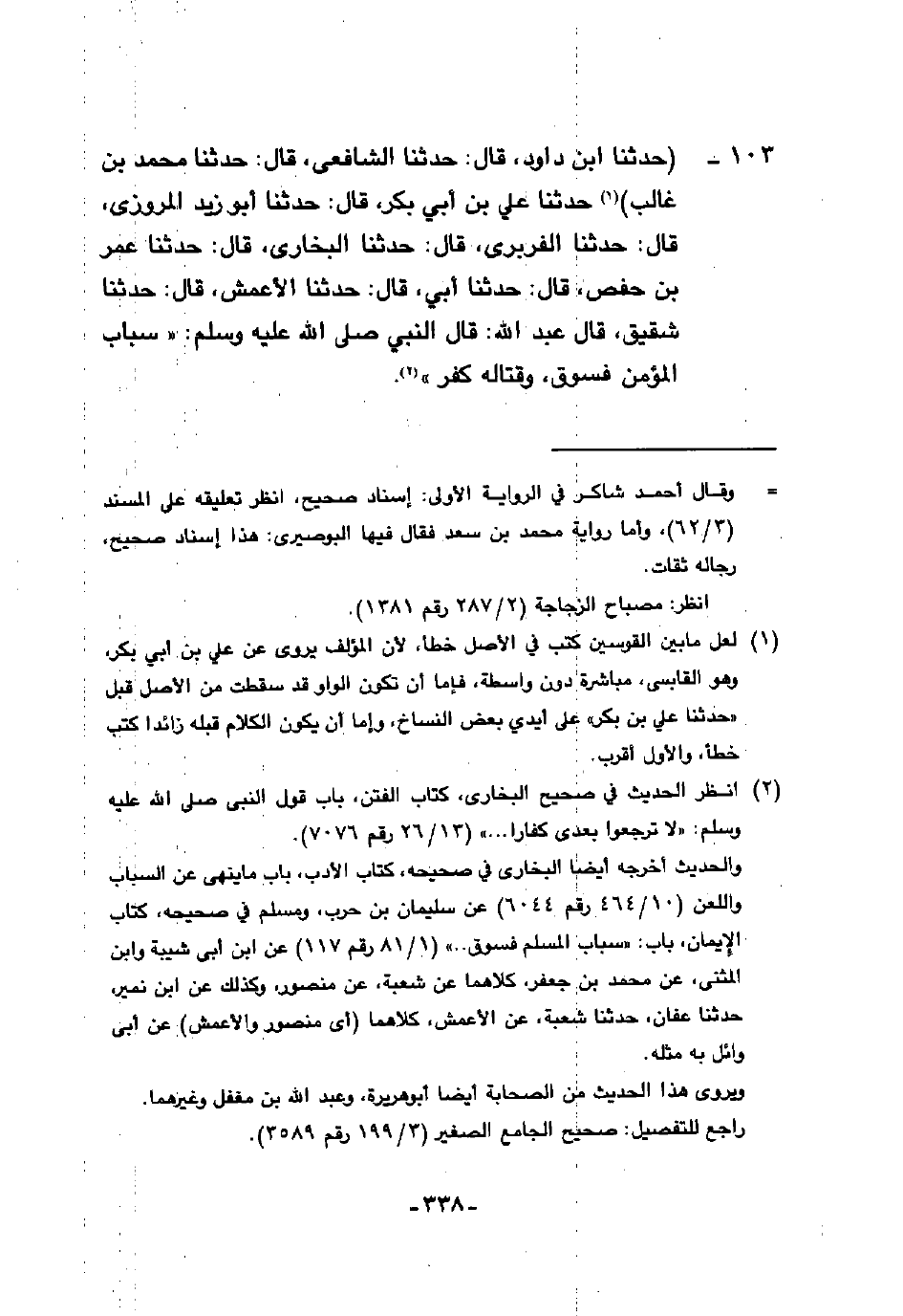 103 - حَدَّثَنَا ابْنُ دَاوُدَ، قَالَ: حَدَّثَنَا الشَّافِعِيُّ، قَالَ: حَدَّثَنَا مُحَمَّدُ بْنُ غَالِبٍ، حَدَّثَنَا عَلِيُّ بْنُ أَبِي بَكْرٍ، قَالَ: حَدَّثَنَا أَبُو زَيْدٍ الْمَرْوَزِيُّ، قَالَ: حَدَّثَنَا الْفَرَبْرِيُّ، قَالَ: حَدَّثَنَا الْبُخَارِيُّ، قَالَ: حَدَّثَنَا عُمَرُ بْنُ حَفْصٍ، قَالَ: حَدَّثَنَا أَبِي قَالَ: حَدَّثَنَا الْأَعْمَشُ، قَالَ: حَدَّثَنَا شَقِيقٌ، قَالَ عَبْدُ اللَّهِ: قَالَ النَّبِيُّ صَلَّى اللهُ عَلَيْهِ وَسَلَّمَ: «§سِبَابُ الْمُؤْمِنِ فُسُوقٌ، وَقِتَالُهُ كُفْرٌ»