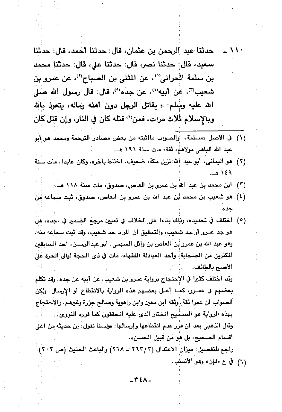 110 - حَدَّثَنَا عَبْدُ الرَّحْمَنِ بْنُ عُثْمَانَ، قَالَ: حَدَّثَنَا أَحْمَدُ، قَالَ: حَدَّثَنَا سَعِيدٌ، قَالَ: حَدَّثَنَا نَصْرٌ، قَالَ: حَدَّثَنَا عَلِيٌّ، قَالَ: حَدَّثَنَا مُحَمَّدُ بْنُ سَلَمَةَ الْحَرَّانِيُّ، عَنِ الْمُثَنَّى بْنِ الصَّبَّاحِ، عَنْ عَمْرِو بْنِ شُعَيْبٍ، عَنْ أَبِيهِ، عَنْ جَدِّهِ، قَالَ: قَالَ رَسُولُ اللَّهِ صَلَّى اللهُ عَلَيْهِ وَسَلَّمَ: «§يُقَاتِلُ الرَّجُلُ دُونَ أَهْلِهِ وَمَالِهِ، يَتَعَوَّذُ بِاللَّهِ وَبِالْإِسْلَامِ ثَلَاثَ مَرَّاتٍ، فَمَنْ قَتَلَهُ كَانَ فِي النَّارِ، وَإِنْ قُتِلَ كَانَ شَهِيدًا»