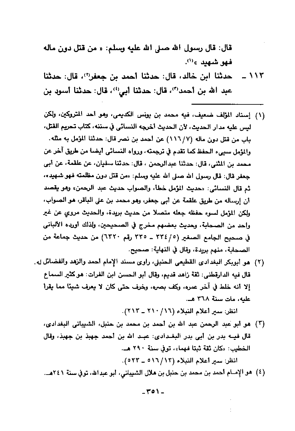 113 - حَدَّثَنَا ابْنُ خَالِدٍ، قَالَ: حَدَّثَنَا أَحْمَدُ بْنُ جَعْفَرٍ، قَالَ: حَدَّثَنَا عَبْدُ اللَّهِ بْنُ أَحْمَدَ، قَالَ: حَدَّثَنَا أَبِي قَالَ: حَدَّثَنَا أَسْوَدُ -[352]- بْنُ عَامِرٍ، قَالَ: حَدَّثَنَا حَسَنٌ، عَنْ إِبْرَاهِيمَ بْنِ الْمُهَاجِرِ، عَنْ أَبِي بَكْرٍ يَعْنِي ابْنَ حَفْصٍ، فَذَكَرَ قِصَّةً، قَالَ سَعْدٌ: إِنِّي سَمِعْتُ رَسُولَ اللَّهِ صَلَّى اللهُ عَلَيْهِ وَسَلَّمَ يَقُولُ: §«نِعْمَ الْمَيْتَةُ أَنْ يَمُوتَ الرَّجُلُ دُونَ حَقِّهِ»