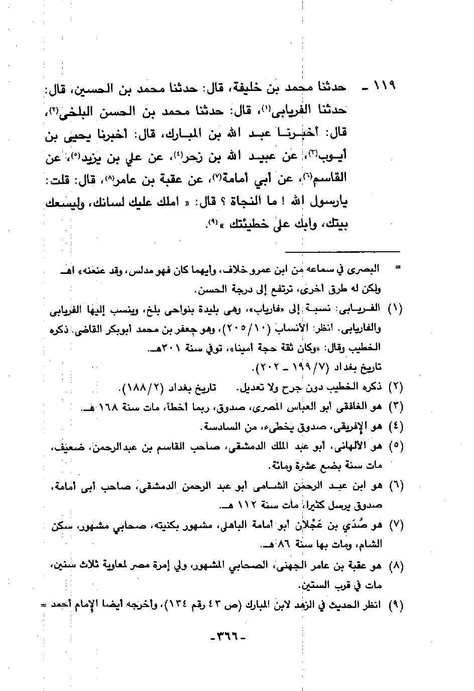 119 - حَدَّثَنَا مُحَمَّدُ بْنُ خَلِيفَةَ، قَالَ: حَدَّثَنَا مُحَمَّدُ بْنُ الْحُسَيْنِ، قَالَ: حَدَّثَنَا الْفِرْيَابِيُّ، قَالَ: حَدَّثَنَا مُحَمَّدُ بْنُ الْحَسَنِ الْبَلْخِيُّ، قَالَ: أَخْبَرَنَا عَبْدُ اللَّهِ بْنُ الْمُبَارَكِ، قَالَ: أَخْبَرَنَا يَحْيَى بْنُ أَيُّوبَ، عَنْ عُبَيْدِ اللَّهِ بْنِ زُحَرَ، عَنْ عَلِيِّ بْنِ يَزِيدَ، عَنِ الْقَاسِمِ، عَنْ أَبِي أُمَامَةَ، عَنْ عُقْبَةَ بْنِ عَامِرٍ، قَالَ: قُلْتُ يَا رَسُولَ اللَّهِ مَا النَّجَاةُ؟ قَالَ: «§امْلِكْ عَلَيْكَ لِسَانَكَ وَلْيَسَعْكَ بَيْتُكَ، وَابْكِ عَلَى خَطِيئَتِكَ»
