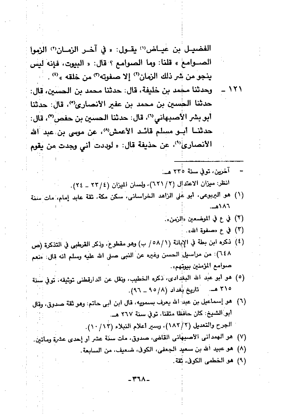 121 - وَحَدَّثَنَا مُحَمَّدُ بْنُ خَلِيفَةَ، قَالَ: حَدَّثَنَا مُحَمَّدُ بْنُ الْحُسَيْنِ، قَالَ: حَدَّثَنَا الْحُسَيْنُ بْنُ مُحَمَّدِ بْنِ عُفَيْرٍ الْأَنْصَارِيُّ، قَالَ: حَدَّثَنَا أَبُو بِشْرٍ الْأَصْبَهَانِيُّ، قَالَ: حَدَّثَنَا الْحُسَيْنُ بْنُ حَفْصٍ، قَالَ: حَدَّثَنَا أَبُو مُسْلِمٍ، قَائِدُ الْأَعْمَشِ، عَنْ مُوسَى بْنِ عَبْدِ اللَّهِ الْأَنْصَارِيِّ، عَنْ حُذَيْفَةَ، قَالَ: §لَوَدِدْتُ أَنِّي وَجَدْتُ مَنْ يَقُومُ لِي فِي مَالِي فَدَخَلْتُ بَيْتِي فَأَغْلَقْتُ بَابِي فَلَمْ يَدْخُلْ عَلَيَّ أَحَدٌ أَبَدًا وَلَمْ أَخْرُجْ إِلَى أَحَدٍ حَتَّى أَلْحَقَ بِاللَّهِ تَعَالَى "