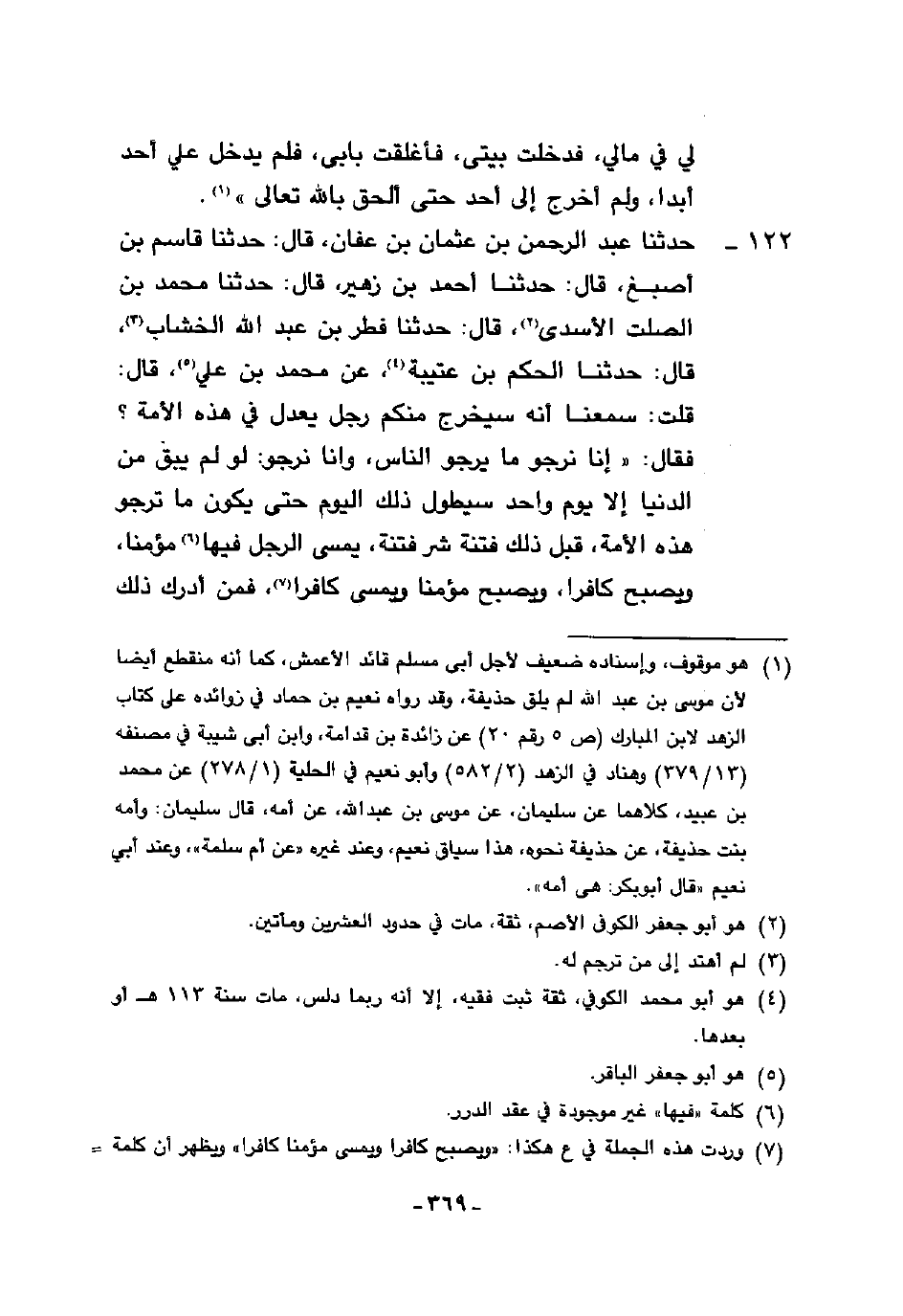 122 - حَدَّثَنَا عَبْدُ الرَّحْمَنِ بْنُ عُثْمَانَ بْنِ عَفَّانَ، قَالَ: حَدَّثَنَا قَاسِمُ بْنُ أَصْبَغَ، قَالَ: حَدَّثَنَا أَحْمَدُ بْنُ زُهَيْرٍ، قَالَ: حَدَّثَنَا مُحَمَّدُ بْنُ الصَّلْتِ الْأَسَدِيُّ، قَالَ: حَدَّثَنَا فِطْرُ بْنُ عَبْدِ اللَّهِ الْخَشَّابُ، قَالَ: حَدَّثَنَا الْحَكَمُ بْنُ عُتَيْبَةَ، عَنْ مُحَمَّدِ بْنِ عَلِيٍّ، قَالَ: قُلْتُ سَمِعْنَا أَنَّهُ سَيَخْرُجُ مِنْكُمْ رَجُلٌ يَعْدِلُ فِي هَذِهِ الْأُمَّةِ فَقَالَ: إِنَّا نَرْجُو مَا يَرْجُو النَّاسُ وَإِنَّا نَرْجُو §لَوْ لَمْ يَبْقَ مِنَ الدُّنْيَا إِلَّا يَوْمٌ وَاحِدٌ سَيَطُولُ ذَلِكَ الْيَوْمُ حَتَّى يَكُونَ مَا تَرْجُو هَذِهِ الْأُمَّةُ قَبْلَ ذَلِكَ فِتْنَةٌ شَرُّ فِتْنَةٍ يُمْسِي الرَّجُلُ فِيهَا مُؤْمِنًا وَيُصْبِحُ كَافِرًا وَيُصْبِحُ مُؤْمِنًا وَيُمْسِي كَافِرًا فَمَنْ أَدْرَكَ ذَلِكَ -[370]- مِنْكُمْ فَلْيَتَّقِ اللَّهَ وَلْيَحْرُزْ دِينَهُ وَلْيَكُنْ مِنْ أَحْلَاسِ بَيْتِهِ "