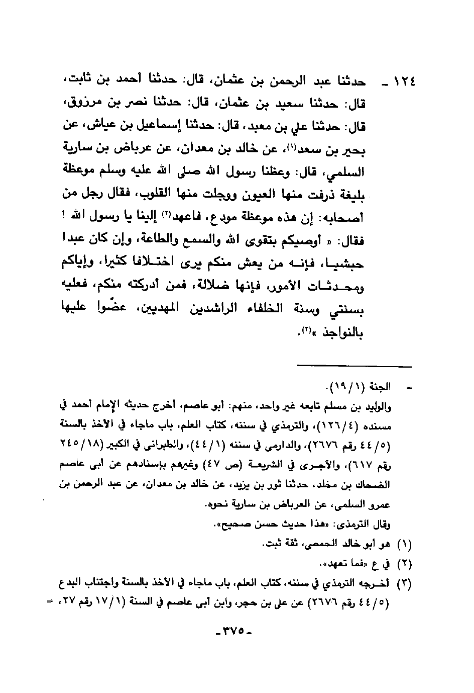 124 - حَدَّثَنَا عَبْدُ الرَّحْمَنِ بْنُ عُثْمَانَ، قَالَ: حَدَّثَنَا أَحْمَدُ بْنُ ثَابِتٍ، قَالَ: حَدَّثَنَا سَعِيدُ بْنُ عُثْمَانَ، قَالَ: حَدَّثَنَا نَصْرُ بْنُ مَرْزُوقٍ، قَالَ: حَدَّثَنَا عَلِيُّ بْنُ مَعَبْدٍ، قَالَ: حَدَّثَنَا إِسْمَاعِيلُ بْنُ عَيَّاشٍ، عَنْ بَحِيرِ بْنِ سَعْدٍ، عَنْ خَالِدِ بْنِ مَعْدَانَ، عَنْ عِرْبَاضِ بْنِ سَارِيَةَ السُّلَمِيِّ، قَالَ: وَعَظَنَا رَسُولُ اللَّهِ صَلَّى اللهُ عَلَيْهِ وَسَلَّمَ مَوْعِظَةً بَلِيغَةً ذَرَفَتْ مِنْهَا الْعُيُونُ، وَوَجِلَتْ مِنْهَا الْقُلُوبُ فَقَالَ رَجُلٌ مِنْ أَصْحَابِهِ: إِنَّ هَذِهِ مَوْعِظَةَ مُوَدَّعٍ فَاعْهَدْ إِلَيْنَا يَا رَسُولَ اللَّهِ فَقَالَ: §«أُوصِيكُمْ بِتَقْوَى اللَّهِ وَالسَّمْعِ وَالطَّاعَةِ وَإِنْ كَانَ عَبْدًا حَبَشِيًّا فَإِنَّهُ مَنْ يَعِشْ مِنْكُمْ يَرَى اخْتِلَافًا كَثِيرًا، وَإِيَّاكُمْ وَمُحْدَثَاتِ الْأُمُورِ فَإِنَّهَا ضَلَالَةٌ فَمَنْ أَدْرَكَتْهُ مِنْكُمْ فَعَلَيْهِ بِسُنَّتِي وَسُنَّةِ الْخُلَفَاءِ الرَّاشِدِينَ الْمَهْدِيِّينَ عُضُّوا عَلَيْهَا بِالنَّوَاجِذِ»
