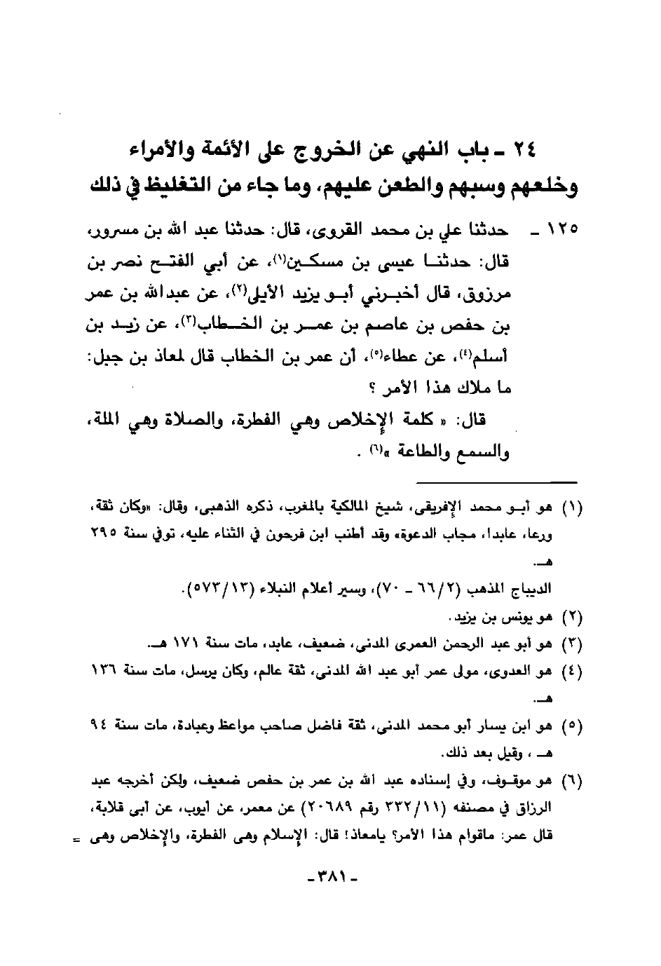 125 - حَدَّثَنَا عَلِيُّ بْنُ مُحَمَّدٍ الْقَرَوِيُّ، قَالَ: حَدَّثَنَا عَبْدُ اللَّهِ بْنُ مَسْرُورٍ، قَالَ: حَدَّثَنَا عِيسَى بْنُ مِسْكِينٍ، عَنْ أَبِي الْفَتْحِ، نَصْرِ بْنِ مَرْزُوقٍ قَالَ: أَخْبَرَنِي أَبُو يَزِيدَ الْأَيْلِيُّ، عَنْ عَبْدِ اللَّهِ بْنِ عُمَرَ بْنِ حَفْصِ بْنِ عَاصِمِ بْنِ عُمَرَ بْنِ الْخَطَّابِ، عَنْ زَيْدِ بْنِ أَسْلَمَ، عَنْ عَطَاءٍ، أَنَّ عُمَرَ بْنَ الْخَطَّابِ، قَالَ لِمُعَاذِ بْنِ جَبَلٍ: مَا مِلَاكُ هَذَا الْأَمْرِ؟ قَالَ: §كَلِمَةُ الْإِخْلَاصِ وَهِيَ الْفِطْرَةُ وَالصَّلَاةُ وَهِيَ الْمِلَّةُ وَالسَّمْعُ وَالطَّاعَةُ "
