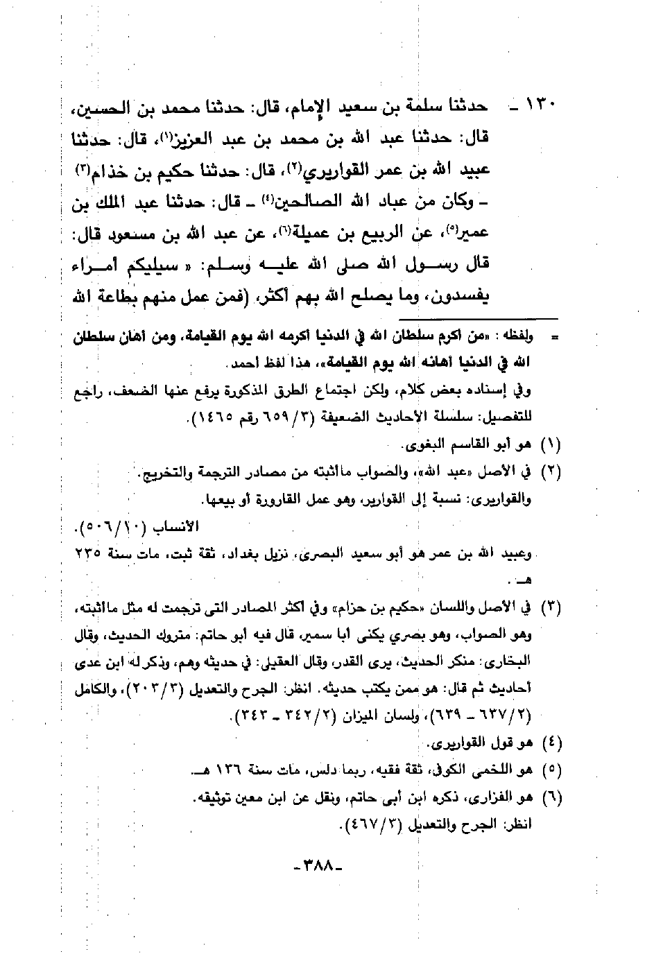 130 - حَدَّثَنَا سَلَمَةُ بْنُ سَعِيدٍ الْإِمَامُ، قَالَ: حَدَّثَنَا مُحَمَّدُ بْنُ الْحُسَيْنِ، قَالَ: حَدَّثَنَا عَبْدُ اللَّهِ بْنُ مُحَمَّدِ بْنِ عَبْدِ الْعَزِيزِ، قَالَ: حَدَّثَنَا عُبَيْدُ اللَّهِ بْنُ عُمَرَ الْقَوَارِيرِيُّ، قَالَ: حَدَّثَنَا حَكِيمُ بْنُ خِذَامٍ، وَكَانَ مِنْ عِبَادِ اللَّهِ الصَّالِحِينَ قَالَ: حَدَّثَنَا عَبْدُ الْمَلِكِ بْنُ عُمَيْرٍ، عَنِ الرَّبِيعِ بْنِ عَمِيلَةَ، عَنْ عَبْدِ اللَّهِ بْنِ مَسْعُودٍ، قَالَ: قَالَ رَسُولُ اللَّهِ صَلَّى اللهُ عَلَيْهِ وَسَلَّمَ: §«سَيَلِيكُمْ أُمَرَاءُ يُفْسِدُونَ وَمَا يُصْلِحُ اللَّهُ بِهِمْ أَكْثَرُ فَمَنْ عَمِلَ مِنْهُمْ بِطَاعَةِ اللَّهِ فَلَهُ الْأَجْرَ وَعَلَيْكُمُ الشُّكْرَ وَمَنْ عَمِلَ مِنْهُمْ بِمَعْصِيَةِ اللَّهِ فَعَلَيْهِمُ الْوِزْرَ وَعَلَيْكُمُ الصَّبْرَ»