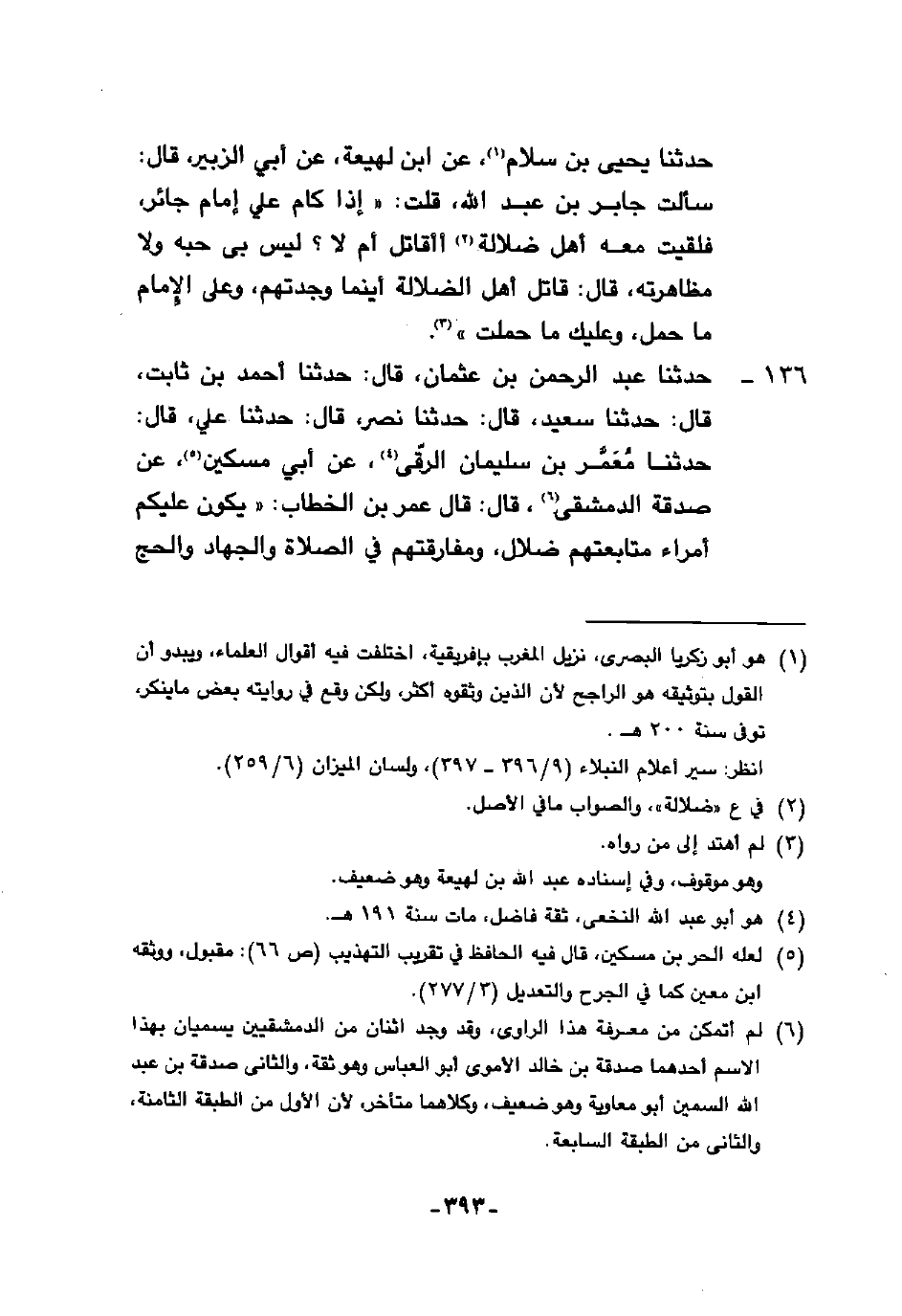 136 - حَدَّثَنَا عَبْدُ الرَّحْمَنِ بْنُ عُثْمَانَ، قَالَ: حَدَّثَنَا أَحْمَدُ بْنُ ثَابِتٍ، قَالَ: حَدَّثَنَا سَعِيدٌ، قَالَ: حَدَّثَنَا نَصْرٌ، قَالَ: حَدَّثَنَا عَلِيٌّ، قَالَ: حَدَّثَنَا مَعْمَرُ بْنُ سُلَيْمَانَ الرَّقِّيُّ، عَنْ أَبِي مِسْكِينٍ، عَنْ صَدَقَةَ الدِّمَشْقِيِّ، قَالَ: قَالَ عُمَرُ بْنُ الْخَطَّابِ: §يَكُونُ عَلَيْكُمْ أُمَرَاءُ مُتَابَعَتُهُمْ ضَلَالٌ، وَمُفَارَقَتُهُمْ فِي الصَّلَاةِ وَالْجِهَادِ وَالْحَجِّ كُفْرٌ "