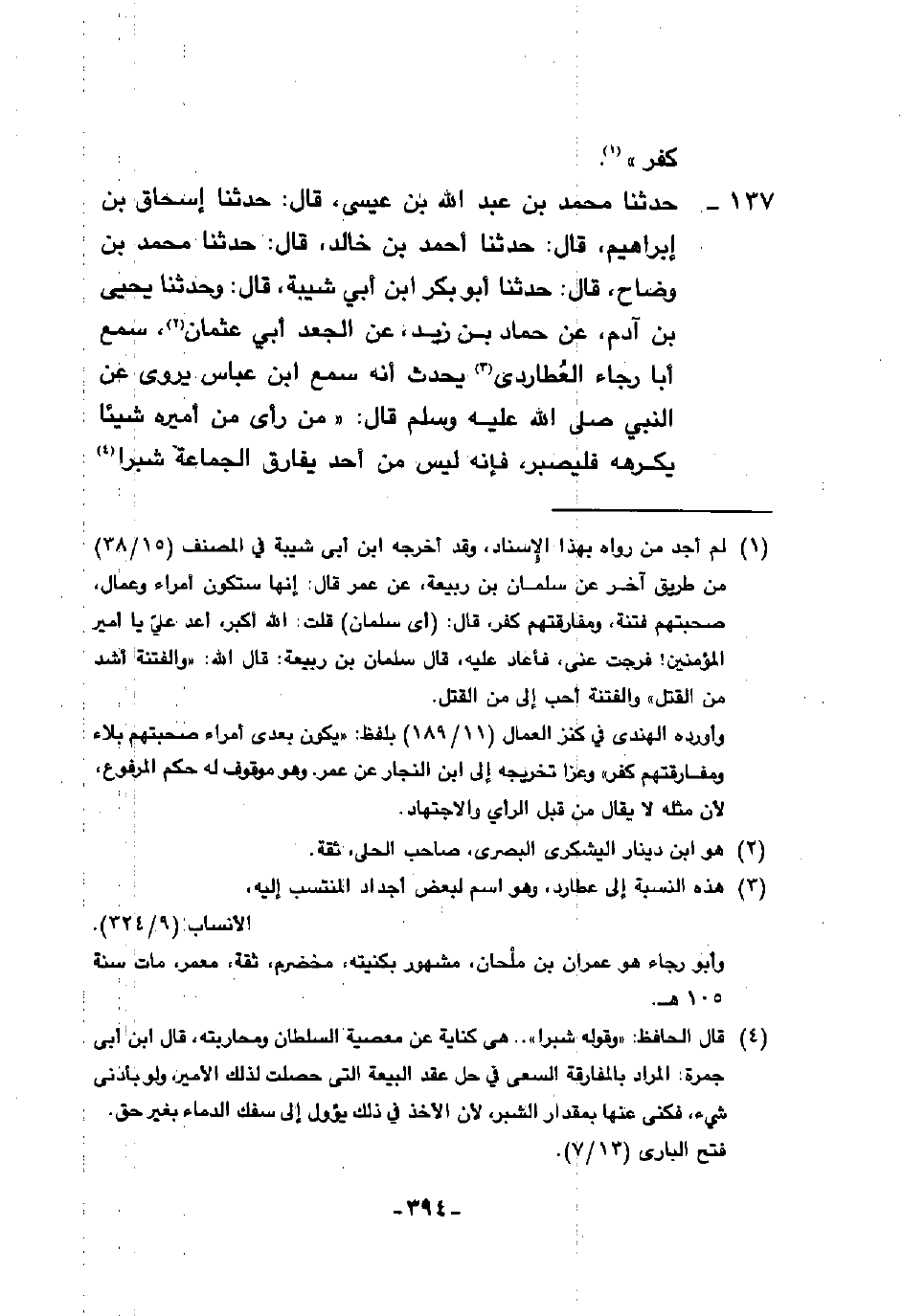 137 - حَدَّثَنَا مُحَمَّدُ بْنُ عَبْدِ اللَّهِ بْنِ عِيسَى، قَالَ: حَدَّثَنَا إِسْحَاقُ بْنُ إِبْرَاهِيمَ، قَالَ: حَدَّثَنَا أَحْمَدُ بْنُ خَالِدٍ، قَالَ: حَدَّثَنَا مُحَمَّدُ بْنُ وَضَّاحٍ، قَالَ: حَدَّثَنَا أَبُو بَكْرِ بْنُ أَبِي شَيْبَةَ، قَالَ: وَحَدَّثَنَا يَحْيَى بْنُ آدَمَ، عَنْ حَمَّادِ بْنِ زَيْدٍ، عَنِ الْجَعْدِ أَبِي عُثْمَانَ، سَمِعَ أَبَا رَجَاءٍ الْعُطَارِدِيَّ، يُحَدِّثُ أَنَّهُ سَمِعَ ابْنَ عَبَّاسٍ، يَرْوِي عَنِ النَّبِيِّ صَلَّى اللهُ عَلَيْهِ وَسَلَّمَ قَالَ: §«مَنْ رَأَى مِنْ أَمِيرِهِ شَيْئًا يَكْرَهُهُ فَلْيَصْبِرْ فَإِنَّهُ لَيْسَ مِنْ أَحَدٍ يُفَارِقُ الْجَمَاعَةَ شِبْرًا فَيَمُوتُ إِلَّا مَاتَ مِيتَةً جَاهِلِيَّةً»