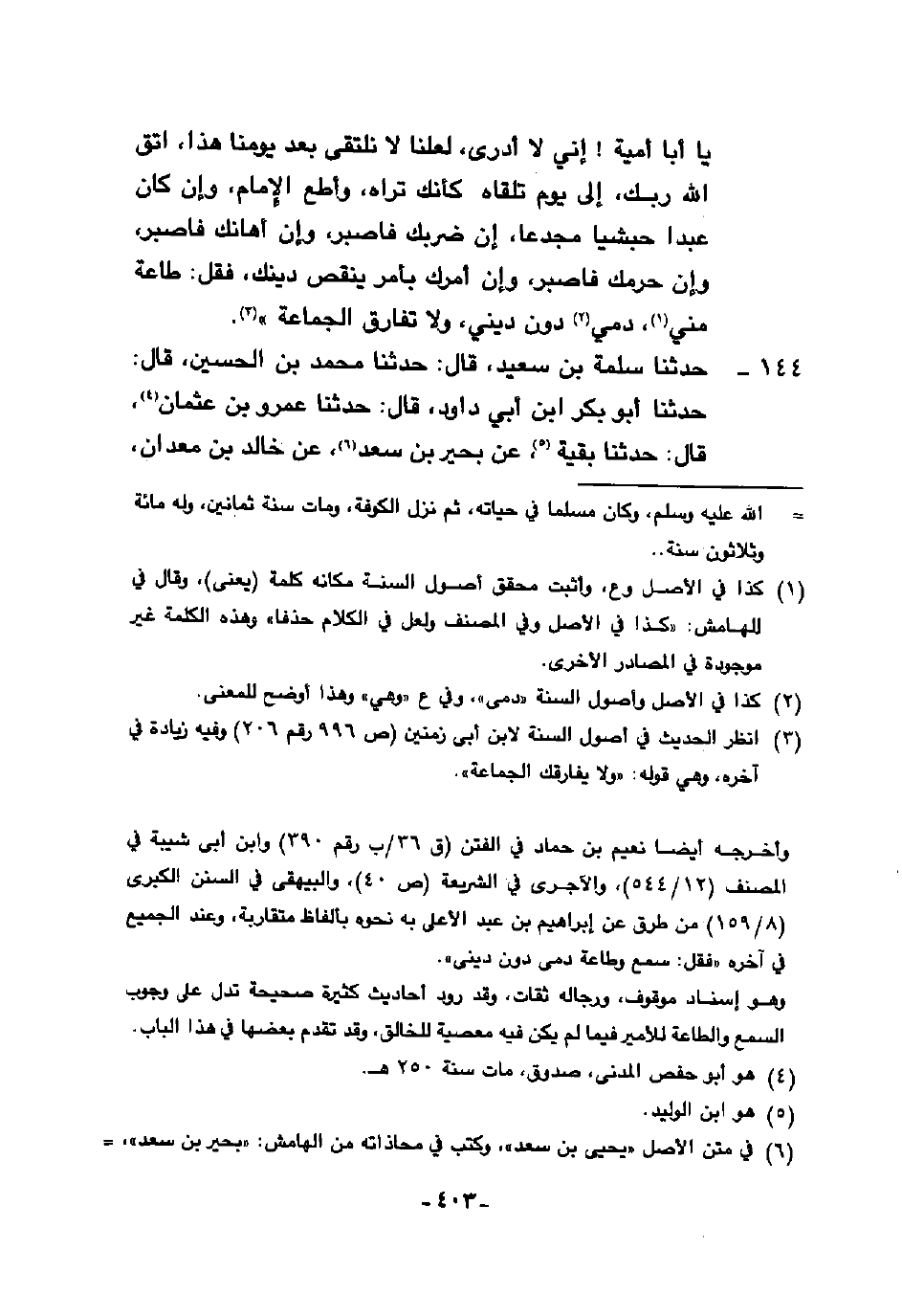 144 - حَدَّثَنَا سَلَمَةُ بْنُ سَعِيدٍ، قَالَ: حَدَّثَنَا مُحَمَّدُ بْنُ الْحُسَيْنِ، قَالَ: حَدَّثَنَا أَبُو بَكْرِ بْنُ أَبِي دَاوُدَ، قَالَ: حَدَّثَنَا عَمْرُو بْنُ عُثْمَانَ، قَالَ: حَدَّثَنَا بَقِيَّةُ، عَنْ بَحِيرِ بْنِ سَعْدٍ، عَنْ خَالِدِ بْنِ مَعْدَانَ، عَنْ عُبَيْدٍ، مَوْلَى خِيَارٍ مِنْ أَهْلِ حِمْصٍ أَنَّهُ سَمِعَ مَالِكَ بْنَ يَخَامِرَ، يُحَدِّثُ عَنْ مُعَاذِ بْنِ جَبَلٍ، قَالَ: §الْأَمِيرُ مَنْ أَمَّرَ اللَّهُ عَزَّ وَجَلَّ فَمَنْ طَعَنَ فِي الْأَمِيرِ فَإِنَّمَا يَطْعَنُ فِي أَمْرِ اللَّهِ عَزَّ وَجَلَّ "
