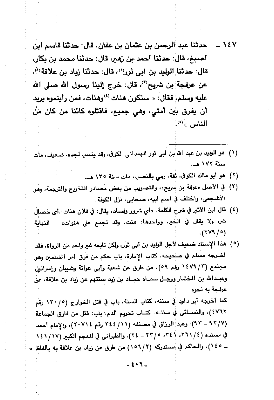 147 - حَدَّثَنَا عَبْدُ الرَّحْمَنِ بْنُ عُثْمَانَ بْنِ عَفَّانَ، قَالَ: حَدَّثَنَا قَاسِمُ بْنُ أَصْبَغَ، قَالَ: حَدَّثَنَا أَحْمَدُ بْنُ زُهَيْرٍ، قَالَ: حَدَّثَنَا مُحَمَّدُ بْنُ بَكَّارٍ، قَالَ: حَدَّثَنَا الْوَلِيدُ بْنُ أَبَى ثَوْرٍ قَالَ: حَدَّثَنَا زِيَادُ بْنُ عِلَاقَةَ، عَنْ عَرْفَجَةَ بْنِ شُرَيْحٍ، قَالَ: خَرَجَ إِلَيْنَا رَسُولُ اللَّهِ صَلَّى اللهُ عَلَيْهِ وَسَلَّمَ فَقَالَ: §«سَتَكُونُ هَنَاتٌ وَهَنَاتٌ فَمَنْ رَأَيْتُمُوهُ يُرِيدُ أَنْ يُفَرِّقَ بَيْنَ أُمَّتِي وَهِيَ جَمِيعٌ فَاقْتُلُوهُ كَائِنًا مَنْ كَانَ مِنَ النَّاسِ»