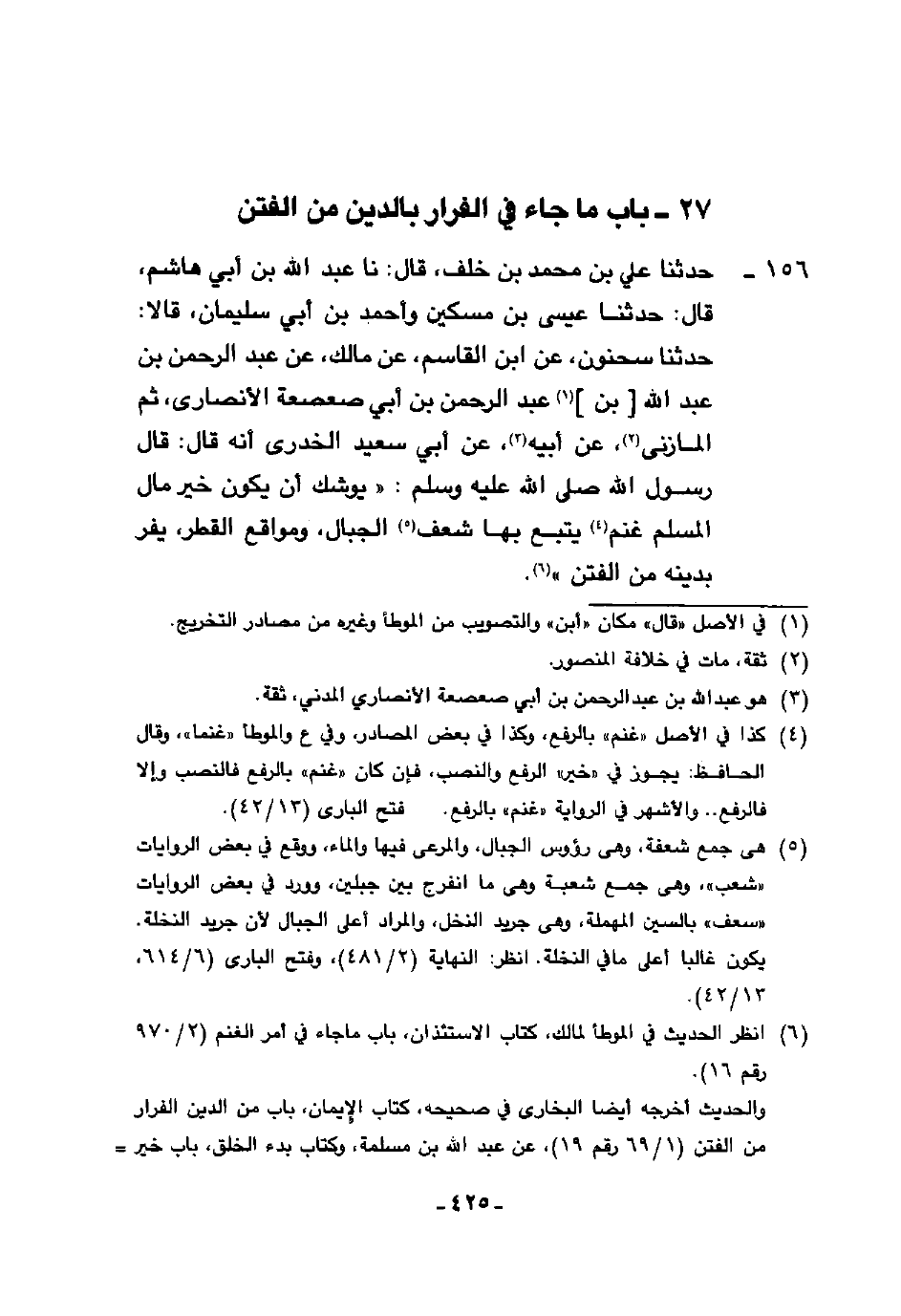 156 - حَدَّثَنَا عَلِيُّ بْنُ مُحَمَّدِ بْنِ خَلَفٍ، قَالَ: نا عَبْدُ اللَّهِ بْنُ أَبِي هَاشِمٍ، قَالَ: حَدَّثَنَا عِيسَى بْنُ مِسْكِينٍ، وَأَحْمَدُ بْنُ أَبِي سُلَيْمَانَ، قَالَا: حَدَّثَنَا سَحْنُونُ، عَنِ ابْنِ الْقَاسِمِ، عَنْ مَالِكٍ، عَنْ عَبْدِ الرَّحْمَنِ بْنِ عَبْدِ اللَّهِ بْنِ عَبْدِ الرَّحْمَنِ بْنِ أَبِي صَعْصَعَةَ الْأَنْصَارِيِّ، ثُمَّ الْمَازِنِيِّ عَنْ أَبِيهِ، عَنْ أَبِي سَعِيدٍ الْخُدْرِيِّ، أَنَّهُ قَالَ: قَالَ رَسُولُ اللَّهِ صَلَّى اللهُ عَلَيْهِ وَسَلَّمَ: §«يُوشِكُ أَنْ يَكُونَ خَيْرَ مَالِ الْمُسْلِمِ غَنَمٌ يَتْبَعُ بِهَا شَعَفَ الْجِبَالِ وَمَوَاقِعَ الْقَطْرِ يَفِرُّ بِدِينِهِ مِنَ الْفِتَنِ»