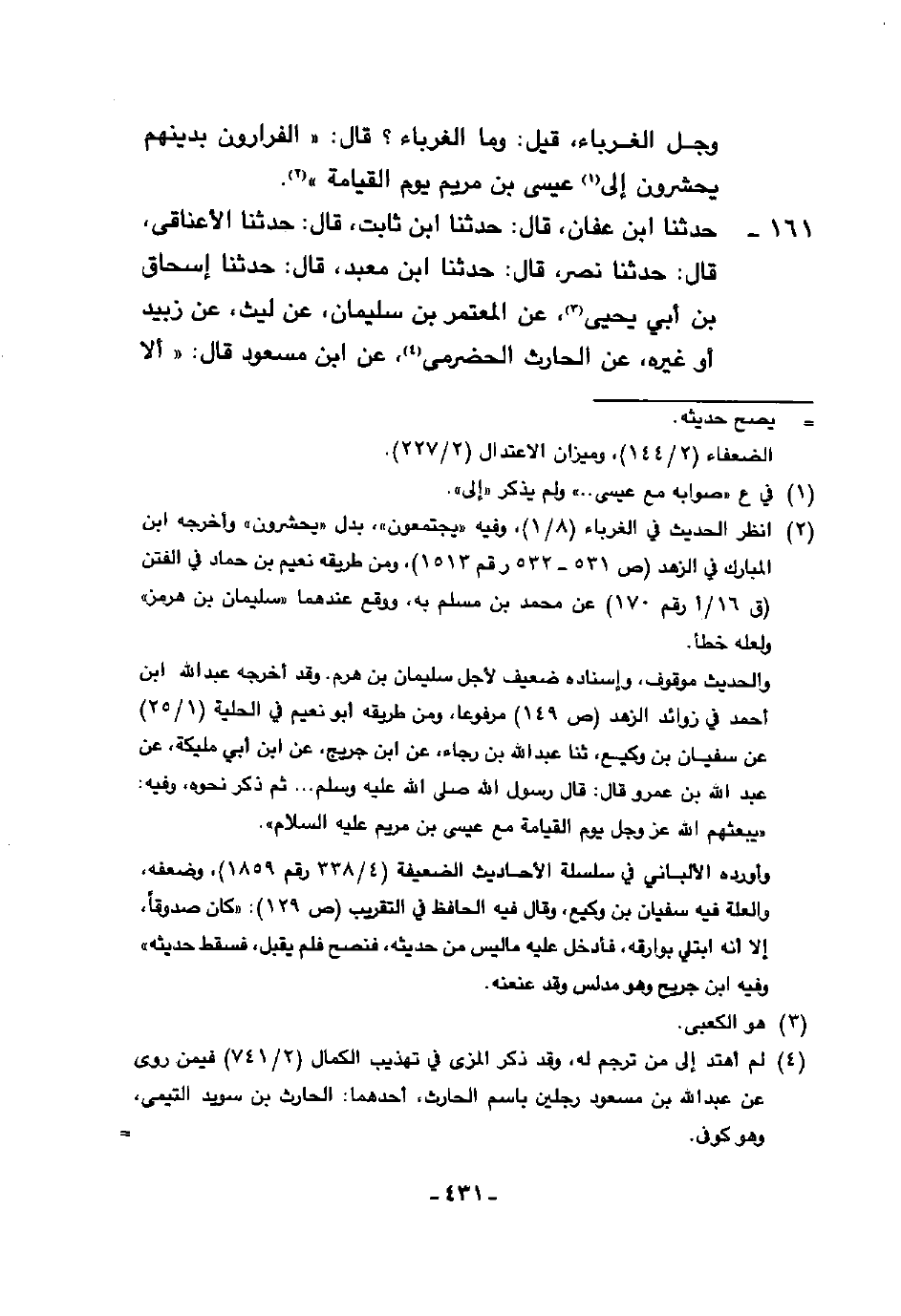 161 - حَدَّثَنَا ابْنُ عَفَّانَ، قَالَ: حَدَّثَنَا ابْنُ ثَابِتٍ، قَالَ: حَدَّثَنَا الْأَعْنَاقِيُّ، قَالَ: حَدَّثَنَا نَصْرٌ، قَالَ: حَدَّثَنَا ابْنُ مَعَبْدٍ، قَالَ: حَدَّثَنَا إِسْحَاقُ بْنُ أَبِي يَحْيَى، عَنِ الْمُعْتَمِرِ بْنِ سُلَيْمَانَ، عَنْ لَيْثٍ، عَنْ زُبَيْدٍ، أَوْ غَيْرِهِ، عَنِ الْحَارِثِ الْحَضْرَمِيِّ، عَنِ ابْنِ مَسْعُودٍ، قَالَ: أَلَا -[432]- أُخْبِرُكُمْ بِخَيْرِ النَّاسِ، فِي ذَلِكَ الزَّمَانِ §كُلُّ غَنِيٍّ خَفِيٍّ "، قَالَ: قُلْتُ: مَا أَنَا بِالْغِنَيِّ، وَلَا الْخَفِيِّ قَالَ: كُنْ كَابْنِ لَبُونٍ بِلَا ضَرْعٍ فَتُحْلَبَ وَلَا ظَهْرٍ فَتُرْكَبَ قَالَ: أَلَا أُخْبِرُكُمْ بِشَرِّ النَّاسِ فِي ذَلِكَ الزَّمَانِ كُلُّ خَطِيبٍ مُصْقَعٍ أَوْ رَاكِبٍ مَوْضَعٍ "