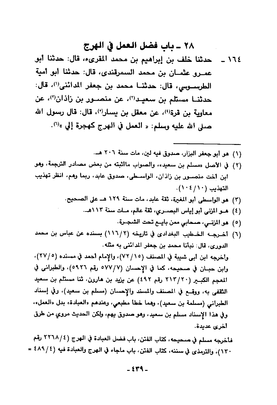 164 - حَدَّثَنَا خَلَفُ بْنُ إِبْرَاهِيمَ بْنِ مُحَمَّدٍ الْمُقْرِئُ، قَالَ: حَدَّثَنَا أَبُو عَمْرٍو، عُثْمَانُ بْنُ مُحَمَّدٍ السَّمَرْقَنْدِيُّ قَالَ: حَدَّثَنَا أَبُو أُمَيَّةَ الطَّرَسُوسِيُّ، قَالَ: حَدَّثَنَا مُحَمَّدُ بْنُ جَعْفَرٍ الْمَدَائِنِيُّ، قَالَ: حَدَّثَنَا مُسْتَلِمُ بْنُ سَعِيدٍ، عَنْ مَنْصُورِ بْنِ زَاذَانَ، عَنْ مُعَاوِيَةَ بْنِ قُرَّةَ، عَنْ مَعْقِلِ بْنِ يَسَارٍ، قَالَ: قَالَ رَسُولُ اللَّهِ صَلَّى اللهُ عَلَيْهِ وَسَلَّمَ: §«الْعَمَلُ فِي الْهَرْجِ كَهِجْرَةٍ إِلَيَّ»