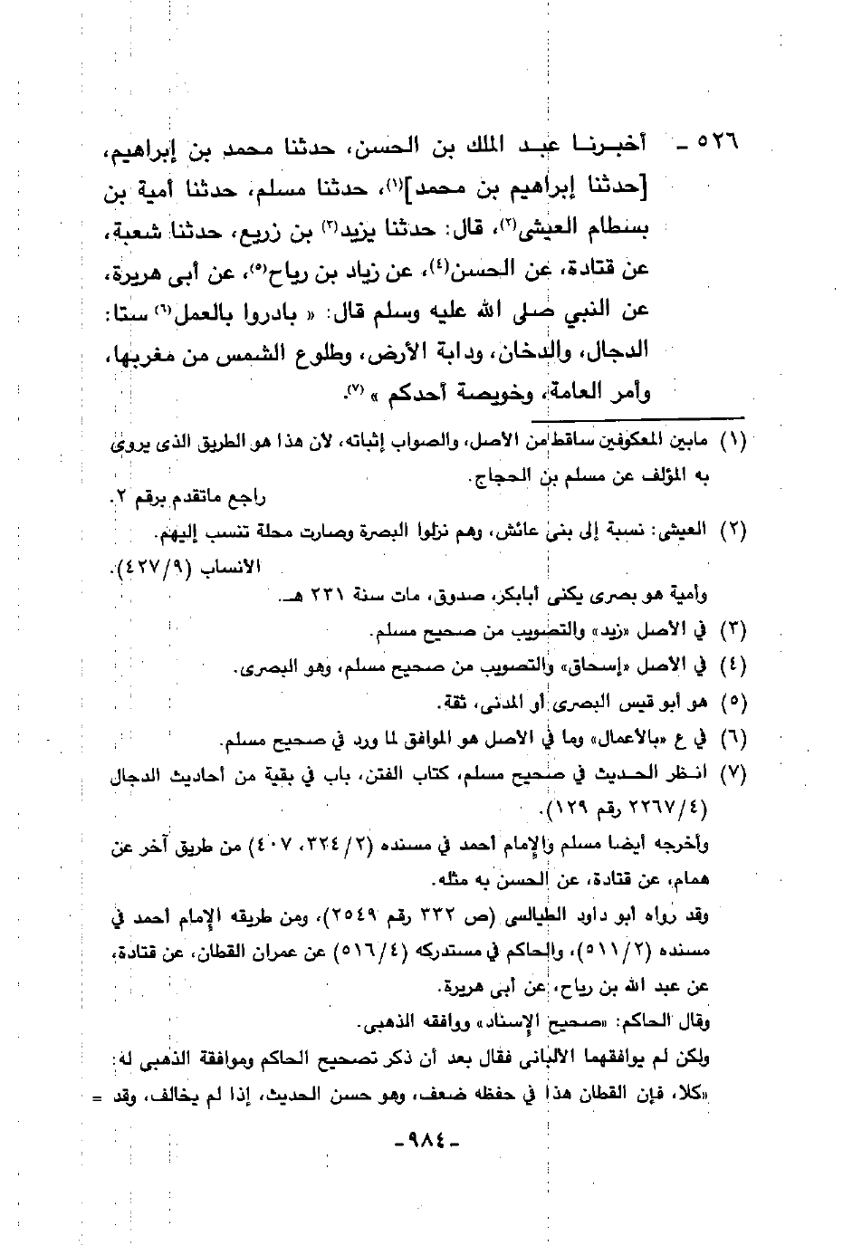 526 - أَخْبَرَنَا عَبْدُ الْمَلِكِ بْنُ الْحَسَنِ، حَدَّثَنَا مُحَمَّدُ بْنُ إِبْرَاهِيمَ، حَدَّثَنَا إِبْرَاهِيمُ بْنُ مُحَمَّدٍ، حَدَّثَنَا مُسْلِمٌ، حَدَّثَنَا أُمَيَّةُ بْنُ بِسْطَامٍ الْعَيْشِيُّ، قَالَ: حَدَّثَنَا يَزِيدُ بْنُ زُرَيْعٍ، حَدَّثَنَا شُعْبَةُ، عَنْ قَتَادَةَ، عَنِ الْحَسَنِ، عَنْ زِيَادِ بْنِ رِيَاحٍ، عَنْ أَبِي هُرَيْرَةَ، عَنِ النَّبِيِّ صَلَّى اللهُ عَلَيْهِ وَسَلَّمَ، قَالَ: " §بَادِرُوا بِالْعَمَلِ سِتًّا: الدَّجَّالَ، وَالدُّخَانَ، وَدَابَّةَ الْأَرْضِ، وَطُلُوعَ الشَّمْسِ مِنْ مَغْرِبِهَا، وَأَمْرَ الْعَامَّةِ، وَخُوَيْصَّةَ أَحَدِكُمْ "