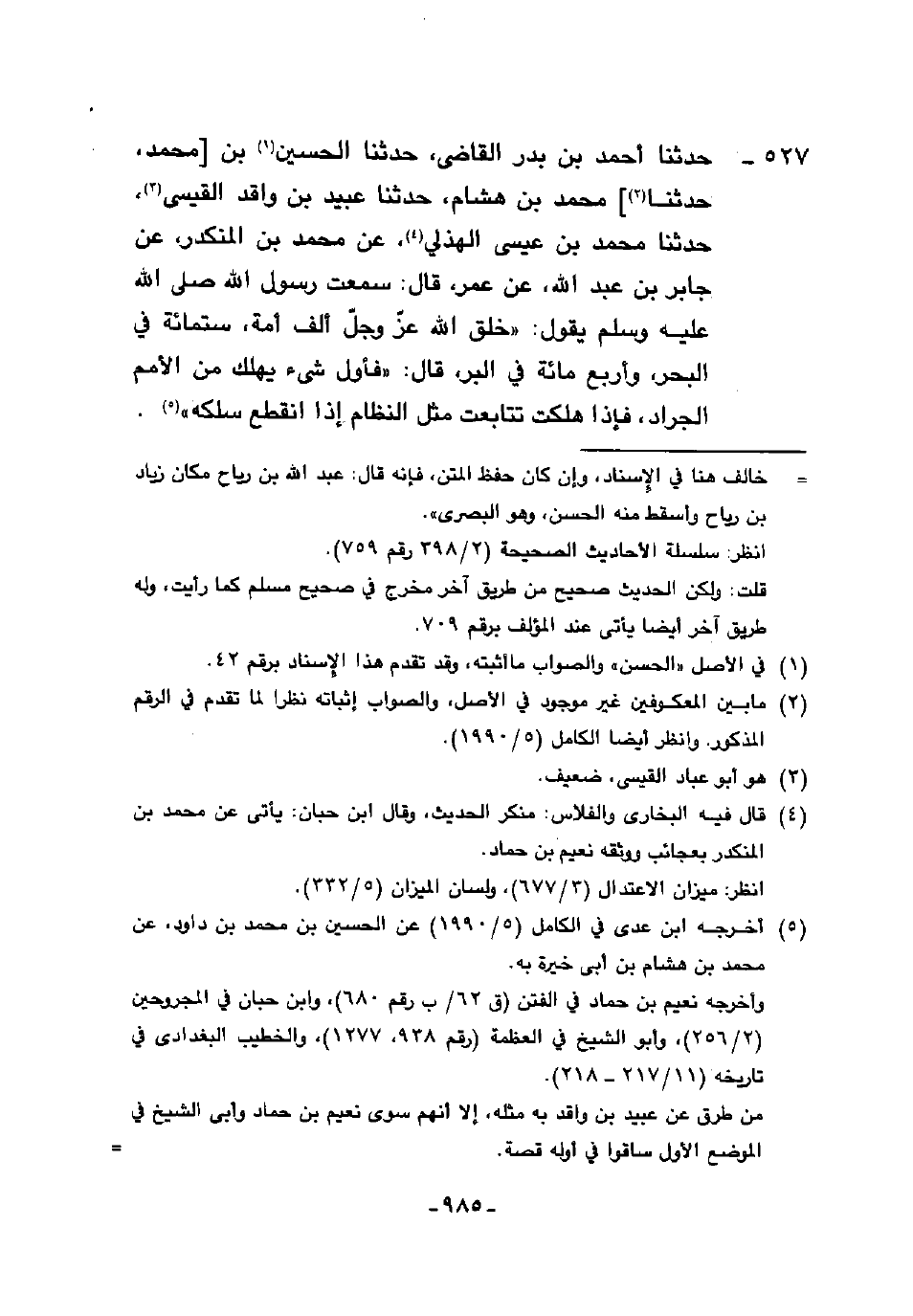 527 - حَدَّثَنَا أَحْمَدُ بْنُ بَدْرٍ الْقَاضِي، حَدَّثَنَا الْحُسَيْنُ بْنُ مُحَمَّدٍ، حَدَّثَنَا مُحَمَّدُ بْنُ هِشَامٍ، حَدَّثَنَا عُبَيْدُ بْنُ وَاقِدٍ الْقَيْسِيُّ، حَدَّثَنَا مُحَمَّدُ بْنُ عِيسَى الْهُذَلِيُّ، عَنْ مُحَمَّدِ بْنِ الْمُنْكَدِرِ، عَنْ جَابِرِ بْنِ عَبْدِ اللَّهِ، عَنْ عُمَرَ، قَالَ: سَمِعْتُ رَسُولَ اللَّهِ صَلَّى اللهُ عَلَيْهِ وَسَلَّمَ، يَقُولُ: §" خَلَقَ اللَّهُ عَزَّ وَجَلَّ أَلْفَ أُمَّةٍ سِتَّمِائَةٍ فِي الْبَحْرِ وَأَرْبَعَ مِائَةٍ فِي الْبَرِّ، قَالَ: فَأَوَّلُ شَيْءٍ يَهْلِكُ مِنَ الْأُمَمِ الْجَرَادُ فَإِذَا هَلَكَتْ تَتَابَعَتْ مِثْلَ النِّظَامِ إِذَا انْقَطَعَ سِلْكُهُ "