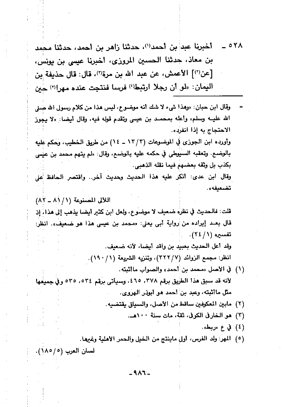 528 - أَخْبَرَنَا عَبْدُ بْنُ أَحْمَدَ، حَدَّثَنَا زَاهِرُ بْنُ أَحْمَدَ، حَدَّثَنَا مُحَمَّدُ بْنُ مُعَاذٍ، حَدَّثَنَا الْحُسَيْنُ الْمَرْوَزِيُّ، أَخْبَرَنَا عِيسَى بْنُ يُونُسَ، عَنِ الْأَعْمَشِ، عَنْ عَبْدِ اللَّهِ بْنِ مُرَّةَ، قَالَ: قَالَ حُذَيْفَةُ بْنُ الْيَمَانِ «§لَوْ أَنَّ رَجُلًا، ارْتَبَطَ فَرَسًا فَنُتِجَتْ عِنْدَهُ مُهْرًا حِينَ تَرَى أَوَّلَ الْآيَاتِ لَمْ يَرْكَبْ حَتَّى يَرَى آخِرَهَا»