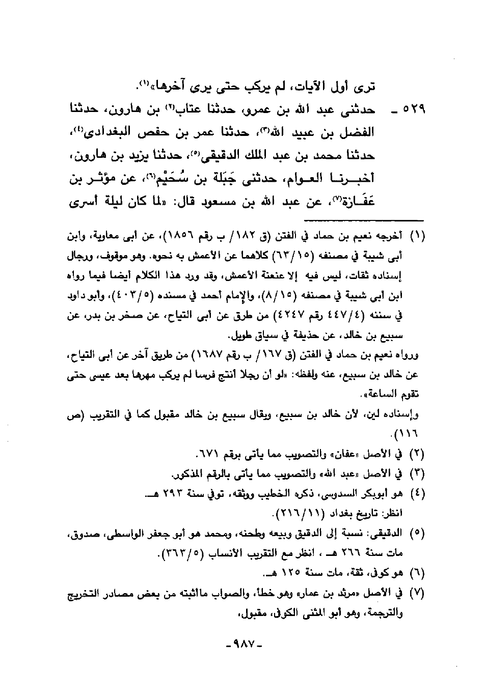529 - حَدَّثَنِي عَبْدُ اللَّهِ بْنُ عَمْرٍو، حَدَّثَنَا عَتَّابُ بْنُ هَارُونَ، حَدَّثَنَا الْفَضْلُ بْنُ عُبَيْدِ اللَّهِ، حَدَّثَنَا عُمَرُ بْنُ حَفْصٍ الْبَغْدَادِيُّ، حَدَّثَنَا مُحَمَّدُ بْنُ عَبْدِ الْمَلِكِ الدَّقِيقِيُّ، حَدَّثَنَا يَزِيدُ بْنُ هَارُونَ، أَخْبَرَنَا الْعَوَّامُ، حَدَّثَنِي جَبَلَةُ بْنُ سُحَيْمٍ، عَنْ مُؤْثِرِ بْنِ عَفَازَةَ، عَنْ عَبْدِ اللَّهِ بْنِ مَسْعُودٍ، قَالَ: §" لَمَّا كَانَ لَيْلَةُ أُسْرِيَ -[988]- بِرَسُولِ اللَّهِ صَلَّى اللهُ عَلَيْهِ وَسَلَّمَ لَقِيَ إِبْرَاهِيمَ وَمُوسَى وَعِيسَى صَلَّى اللَّهُ عَلَيْهِمْ، فَتَذَاكَرُوا السَّاعَةَ مَتَى هِيَ فَبَدَأُوا فَسَأَلُوهُ عَنْهَا فَلَمْ يَكُنْ عِنْدَهُ مِنْهَا عِلْمٌ فَرَدُّوا الْحَدِيثَ إِلَى عِيسَى صَلَّى اللهُ عَلَيْهِ وَسَلَّمَ فَقَالَ: عَهِدَ اللَّهُ إِلَيَّ فِيمَا دُونَ وَجْبَتِهَا، فَأَمَّا وَجْبَتُهَا فَلَا يَعْلَمُهَا إِلَّا اللَّهُ عَزَّ وَجَلَّ، قَالَ: فَذَكَرَ خُرُوجَ الدَّجَّالِ وَيَأْجُوجَ وَمَأْجُوجَ، قَالَ: فَعَهِدَ اللَّهُ إِلَيَّ أَنَّهُ إِذَا كَانَ ذَلِكَ إِنَّ السَّاعَةَ مِنَ النَّاسِ كَالْحَامِلِ الْمُتِمِّ لَا يَدْرِي أَهْلُهَا مَتَى تَفْجَأُهُمْ بِوِلَادَتِهَا لَيْلًا أَوْ نَهَارًا