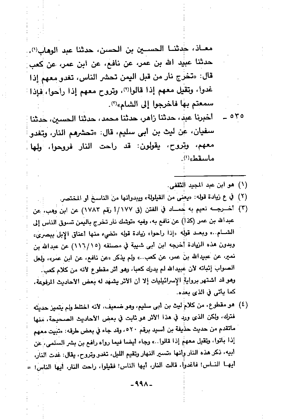 535 - أَخْبَرَنَا عَبْدٌ، حَدَّثَنَا زَاهِرٌ، حَدَّثَنَا مُحَمَّدٌ، حَدَّثَنَا الْحُسَيْنُ، حَدَّثَنَا سُفْيَانُ، عَنْ لَيْثِ بْنِ أَبِي سُلَيْمٍ، قَالَ: «§تَحْشُرُهُمُ النَّارُ وَتَغْدُو مَعَهُمْ وَتَرُوحُ، يَقُولُونَ قَدْ رَاحَتِ النَّارُ فَرُوحُوا وَلَهَا مَا سَقَطَ»
