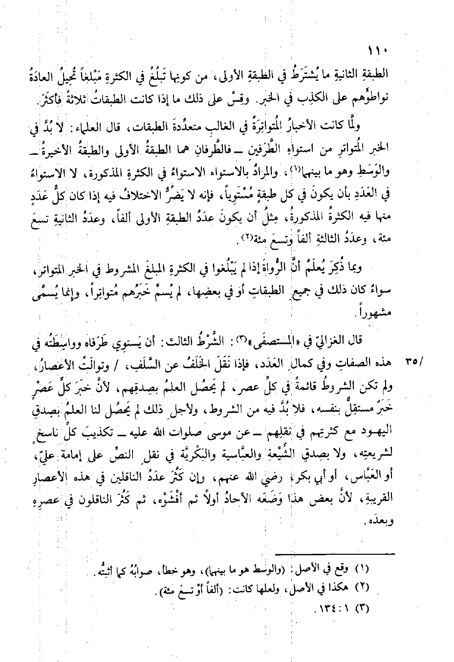 قَالَ الْغَزالِيّ فِي الْمُسْتَصْفى الشَّرْط الثَّالِث أَن يَسْتَوِي طرفاه وواسطته فِي هَذِه الصِّفَات وَفِي كَمَال الْعدَد فَإِذا نقل الْخلف عَن السّلف وتوالت الْأَعْصَار وَلم تكن الشُّرُوط قَائِمَة فِي كل عصر لم يحصل الْعلم بصدقهم لِأَن خبر كل عصر خبر مُسْتَقل بِنَفسِهِ فَلَا بُد فِيهِ من الشُّرُوط وَلأَجل ذَلِك لم يحصل لنا الْعلم بِصدق الْيَهُود مَعَ كثرتهم فِي نقلهم عَن مُوسَى صلوَات الله عَلَيْهِ تَكْذِيب كل نَاسخ لشريعته وَلَا بِصدق الشِّيعَة والعباسية والبكرية فِي نقل النَّص على إِمَامَة عَليّ أَو الْعَبَّاس أَو أبي بكر رَضِي الله عَنْهُم وَإِن كثر عدد الناقلين فِي هَذِه العصار الْقَرِيبَة لِأَن بعض هَذَا وَضعه الْآحَاد اولا ثمَّ أفشوه ثمَّ كثر الناقلون فِي عصره وَبعده
