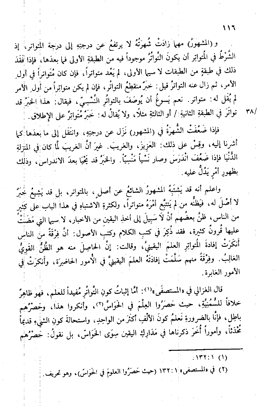 قَالَ الْغَزالِيّ فِي الْمُسْتَصْفى أما إِثْبَات كَون التَّوَاتُر مُفِيدا للْعلم فَهُوَ ظَاهر خلافًا للسمنية حَيْثُ حصروا الْعلم فِي الْحَواس وأنكروا هَذَا وحصرهم بَاطِل فَإنَّا بِالضَّرُورَةِ نعلم كَون اللف أَكثر من الْوَاحِد واستحالة كَون الشَّيْء قَدِيما مُحدثا وامورا أخر ذَكرنَاهَا فِي مدراك الْيَقِين سوى الْحَواس بل نقُول حصرهم