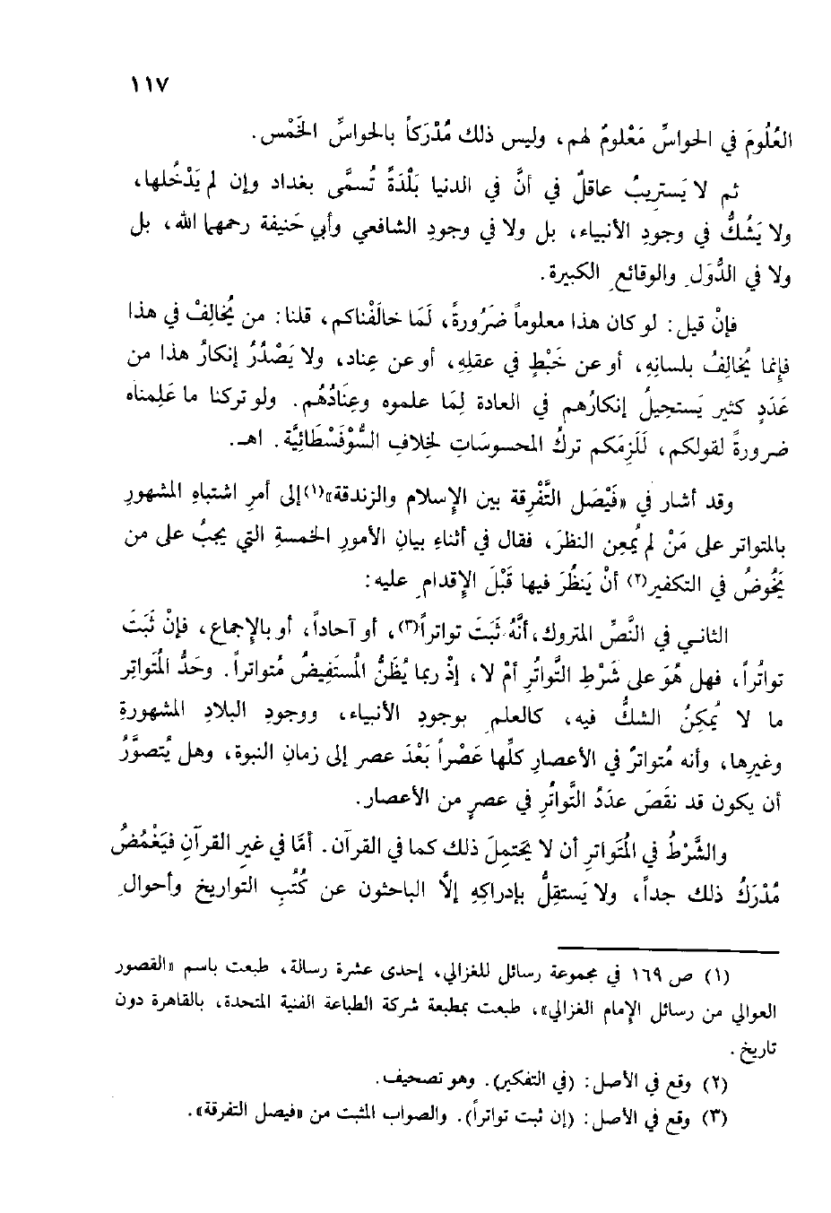 ثمَّ لَا يستريب عَاقل فِي أَن فِي الدُّنْيَا بَلْدَة تسمى بَغْدَاد وَإِن لم يدخلهَا وَلَا يشك فِي وجود النبياء بل وَلَا فِي وجود الشَّافِعِي وَأبي حنيفَة رحمهمَا الله بل وَلَا فِي الدول والوقائع الْكَبِيرَة