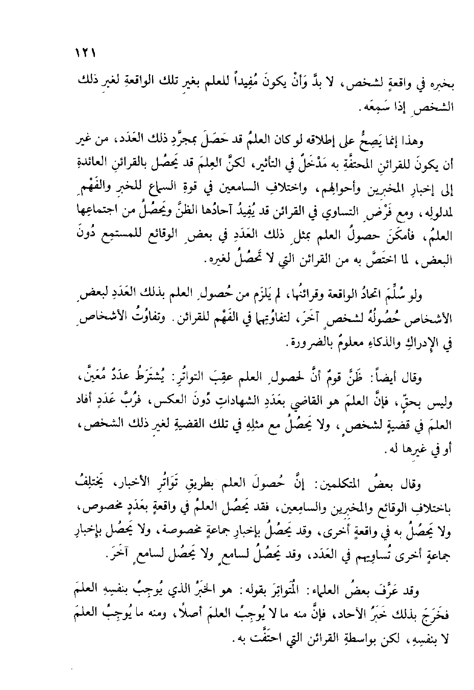 وَقَالَ أَيْضا ظن قوم أَن لحُصُول الْعلم عقب التَّوَاتُر يشْتَرط عدد معِين وَلَيْسَ بِحَق فَإِن الْعلم هُوَ القَاضِي بِعَدَد الشَّهَادَات دون الْعَكْس فَرب عدد أَفَادَ الْعلم فِي قَضِيَّة لشخص وَلَا يحصل مَعَ مثله فِي تِلْكَ الْقَضِيَّة لغير ذَلِك الشَّخْص أَو فِي غَيرهَا لَهُ