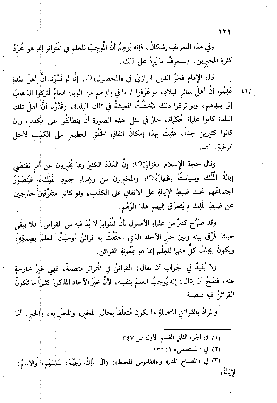 وَقَالَ حجَّة الْإِسْلَام الْغَزالِيّ عَن الْعدَد الْكثير رُبمَا يخبرون عَن أَمر تَقْتَضِي إياله الْملك وسياسته إِظْهَاره والمخبرون من رُؤَسَاء جنود الْملك فيتصور اجْتِمَاعهم تَحت ضبط الإيالة على الِاتِّفَاق على الْكَذِب وَلَو كَانُوا مُتَفَرّقين خَارِجين عَن ضبط الْملك لم يتَطَرَّق إِلَيْهِم هَذَا الْوَهم