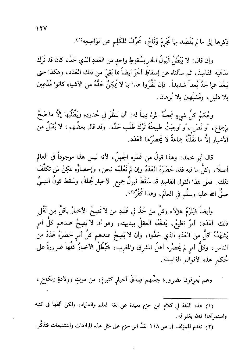 وَأَيْضًا فليزم هَؤُلَاءِ وكل من حد فِي عدد من لَا تصح الْأَخْبَار بِأَقَلّ من نقل ذَلِك الْعدَد أَمر فظيع يَدْفَعهُ الْعقل ببديهته وَهُوَ ان لَا يَصح عِنْدهم كل أَمر يشهده أقل من الْعدَد الَّذِي حدوا وَأَن لَا يَصح عِنْدهم كل أَمر حصره عدد من النَّاس وكل أَمر لم يحصره أهل الْمشرق وَالْمغْرب فَتبْطل الْأَخْبَار كلهَا ضَرُورَة على حكم هَذِه الْأَقْوَال الْفَاسِدَة