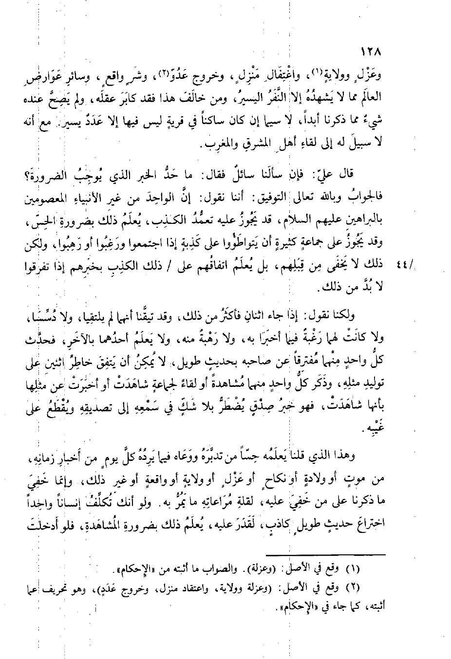 وعزل وَولَايَة واغتفال منزل وَخُرُوج عَدو وَشر وَاقع وَسَائِر عوارض الْعَالم مِمَّا لَا يشهده إِلَّا النَّفر الْيَسِير وَمن خَالف هَذَا فقد كَابر عقله وَلم يَصح عِنْده شَيْء مِمَّا ذكرنَا أبدا لَا سِيمَا إِن كَانَ سَاكِنا فِي قَرْيَة لَيْسَ فِيهَا إِلَّا عدد يسير مَعَ انه لَا سَبِيل لَهُ إِلَى لِقَاء أهل الْمشرق وَالْمغْرب