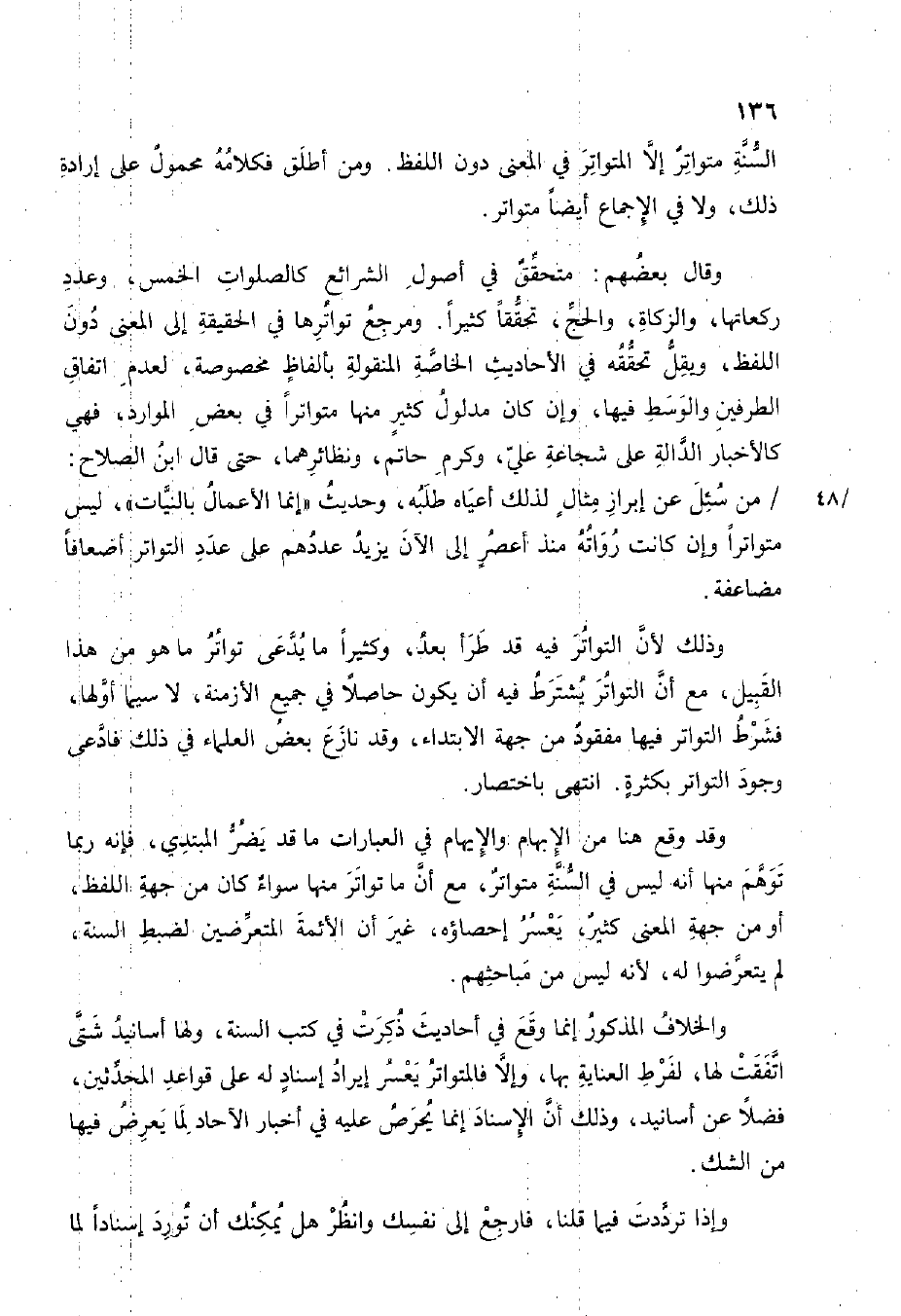 وَقد وَقع هُنَا من الْإِبْهَام وَالْإِيهَام فِي الْعبارَات مَا قد يضر الْمُبْتَدِي فَإِنَّهُ رُبمَا توهم مِنْهَا أَنه لَيْسَ فِي السّنة متواتر مَعَ أَن مَا تَوَاتر مِنْهَا سَوَاء كَانَ من جِهَة اللَّفْظ أَو من جِهَة الْمَعْنى كثير يعسر إحصاؤه غير ان الْأَئِمَّة المتعرضين لضبط السّنة لم يعرضُوا لَهُ لِأَنَّهُ لَيْسَ من مباحثهم