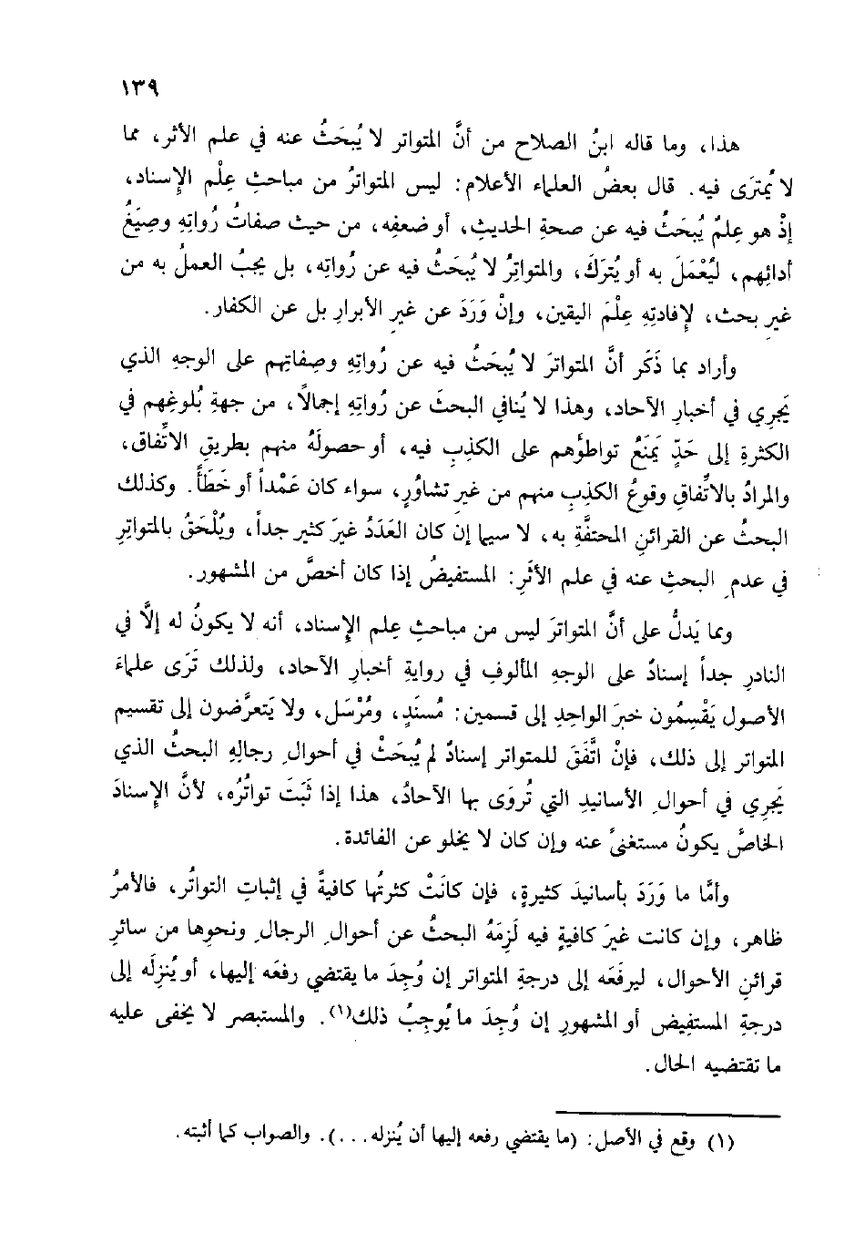 هَذَا وَمَا قَالَه ابْن الصّلاح من ان التَّوَاتُر لَا يبْحَث عَنهُ فِي علم الْأَثر مِمَّا لَا يمترى فِيهِ قَالَ بعض الْعلمَاء العلام لَيْسَ الْمُتَوَاتر من مبَاحث علم الْإِسْنَاد إِذْ هُوَ علم فِيهِ عَن صِحَة الحَدِيث أَو ضعفه من حَيْثُ صِفَات رُوَاته وصيغ أدائهم ليعْمَل بِهِ أَو يتْرك والمتواتر لَا يبْحَث فِيهِ عَن رُوَاته بل يجب الْعَمَل بِهِ من غير بحث لإفادته علم الْيَقِين وغن ورد عَن غير الْأَبْرَار بل عَن الْكفَّار