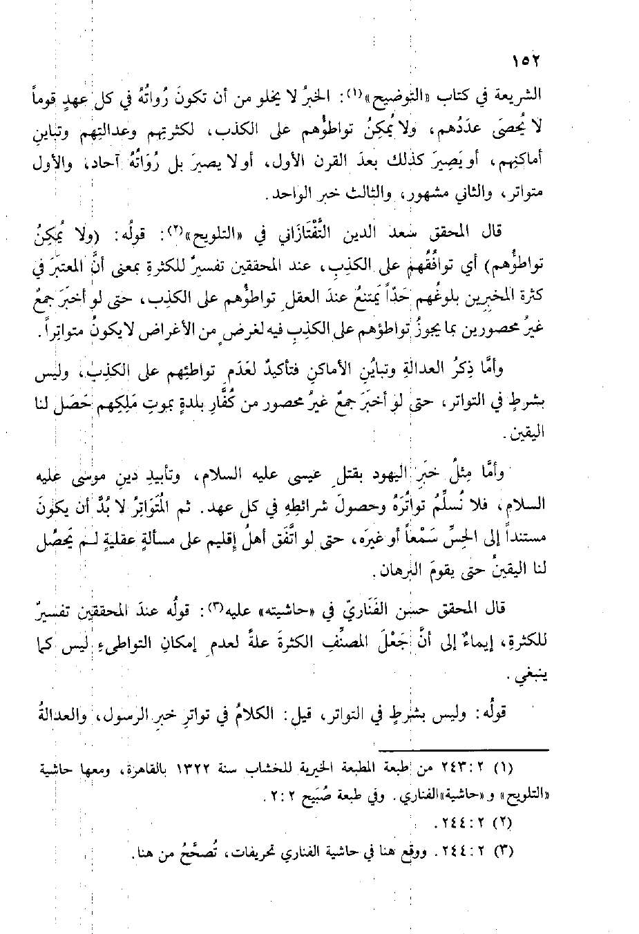 الشَّرِيعَة فِي كتاب التَّوْضِيح الْخَبَر لَا يَخْلُو من أَن تكون رُوَاته فِي كل عهد قوما يُحْصى عَددهمْ وَلَا يُمكن تواطؤهم على الْكَذِب لكثرتهم وعدالتهم وتباين أماكنهم أَو يصير كَذَلِك بعد الْقرن الأول أَو لَا يصير بل رُوَاته آحَاد وَالْأول متواتر وَالثَّانِي مَشْهُور وَالثَّالِث خبر الْوَاحِد
