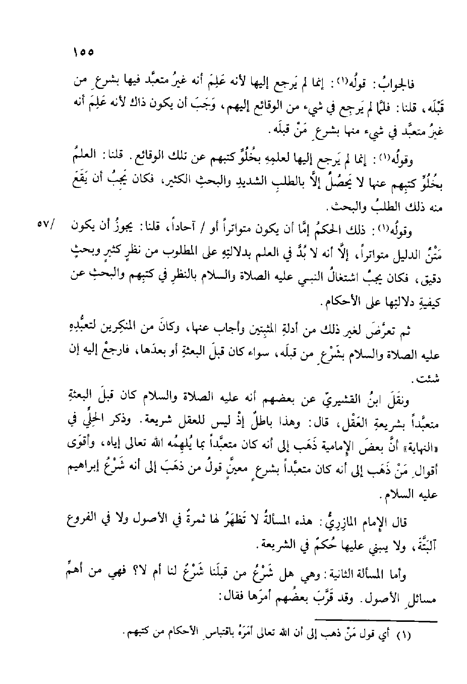 ثمَّ تعرض لغير ذَلِك من أَدِلَّة المثبتين وَأجَاب عَنْهَا وَكَانَ من المنكرين لتعبده عَلَيْهِ الصَّلَاة وَالسَّلَام بشرع من قبله سَوَاء كَانَ قبل الْبعْثَة اَوْ بعْدهَا فَارْجِع إِلَيْهِ إِن شِئْت