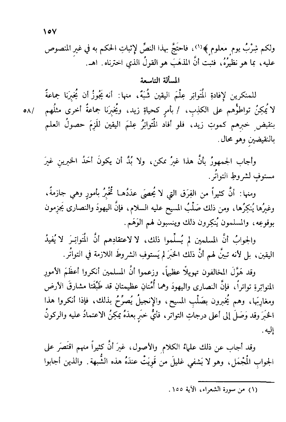 وَالْجَوَاب أَن الْمُسلمين لم يسلمُوا لَا لاعتقادهم أَن الْمُتَوَاتر لَا يُفِيد الْيَقِين بل لِأَنَّهُ تبين لَهُم أَن ذَلِك الْخَبَر لم يسْتَوْف الشُّرُوط اللَّازِمَة فِي التَّوَاتُر